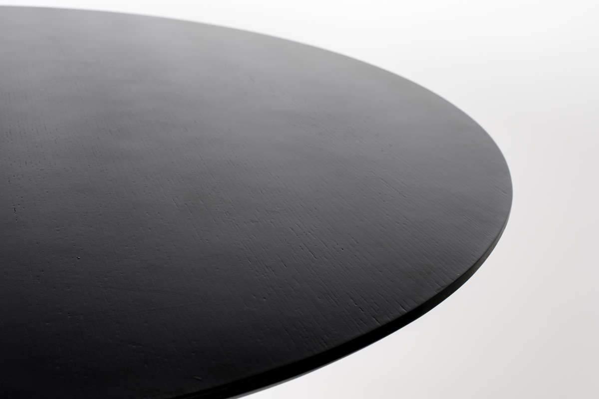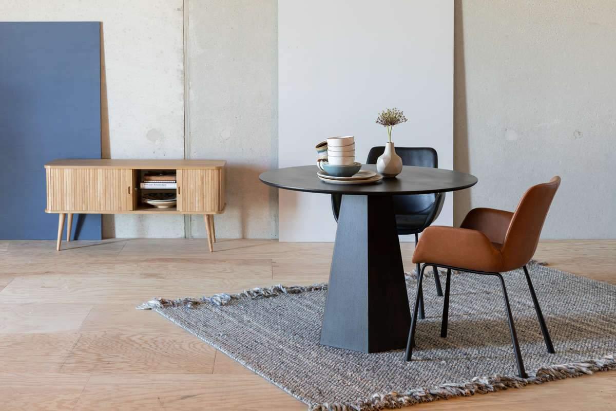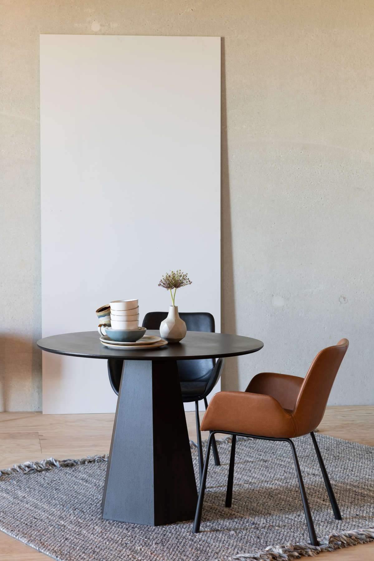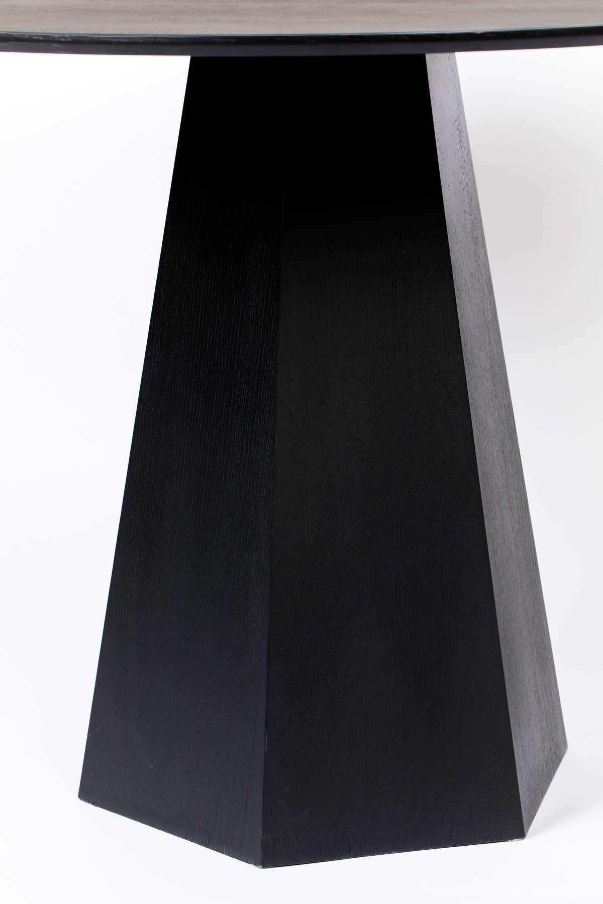 Schwarzer Tisch Pilar ist eine außergewöhnliche Kombination aus einer schlanken Tischplatte und einem geometrischen Gestell. Der Tisch besteht aus Eschenfurnier, das sich hervorragend in einem modernen Esszimmer macht. Er fügt sich perfekt in ein minimalistisches Esszimmer oder ein modernes Wohnzimmer ein.