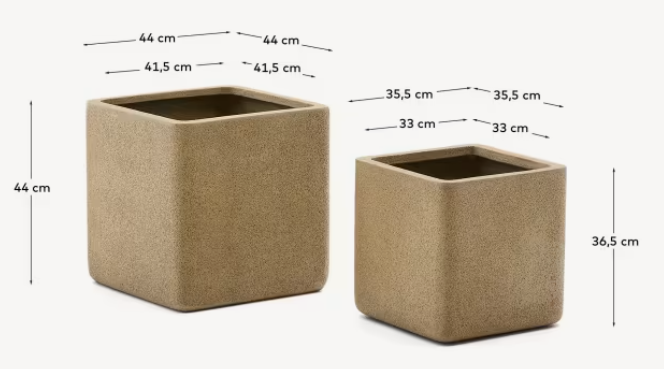 Das Pflanzgefäß-Set Minoa besteht aus Polizement – einem Material, das aus Harz und Steinmehl hergestellt wird und eine steinähnliche Oberfläche imitiert, dabei hohe Festigkeit und Leichtigkeit bietet. Die Pflanzgefäße verfügen über ein Abflussloch im Boden, das eine ordnungsgemäße Ableitung von überschüssigem Wasser ermöglicht. Ihre schlichte, kubische Form und die warme Oberfläche machen sie zu einem universellen Accessoire für sowohl Innen- als auch Außenräume und verleihen der Einrichtung einen modernen und eleganten Charakter.