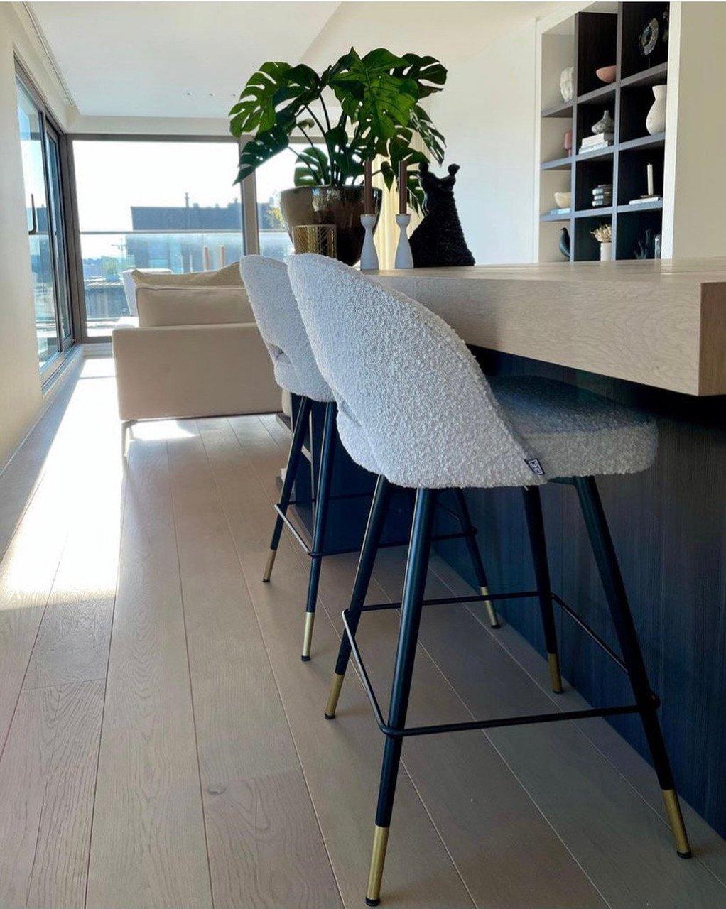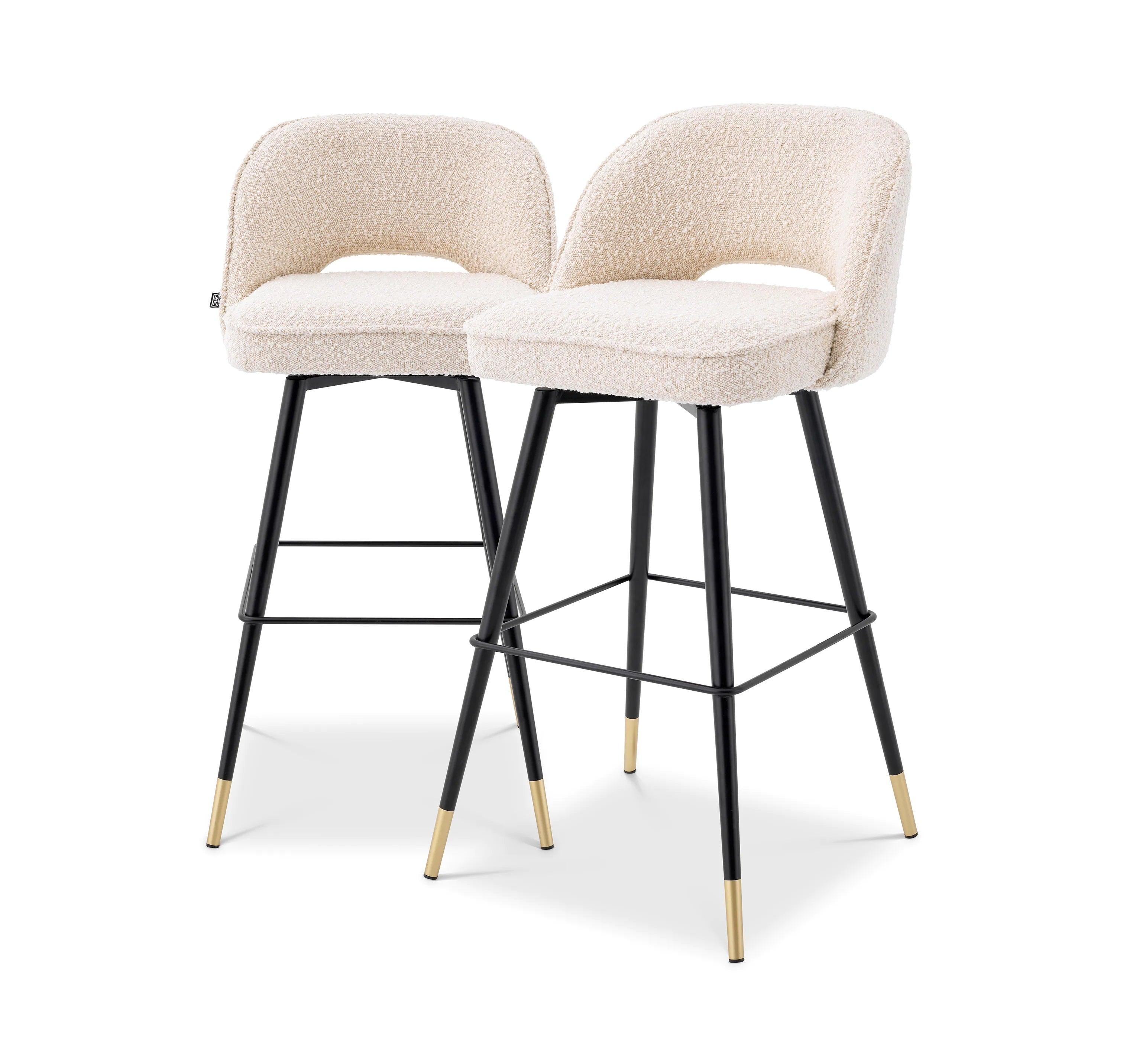 Sorgen Sie für Eleganz und Raffinesse in Ihrem Interieur mit Hockern Cliff. Ein Set aus zwei Hocker aus Boucle-Stoff verkörpert Luxus und Klasse. Jeder cremige Hocker Sie verfügen über einen soliden Rahmen, der auf schwarzen, konisch zulaufenden Beinen ruht, mit einem hervorragenden Akzent in Form von goldenen Auflagen. Ihre Einzigartigkeit wird durch die armlose Rückenlehne betont, die künstlerisch am unteren Ende der Sitzfläche geöffnet wurde und dem Design Leichtigkeit verleiht.