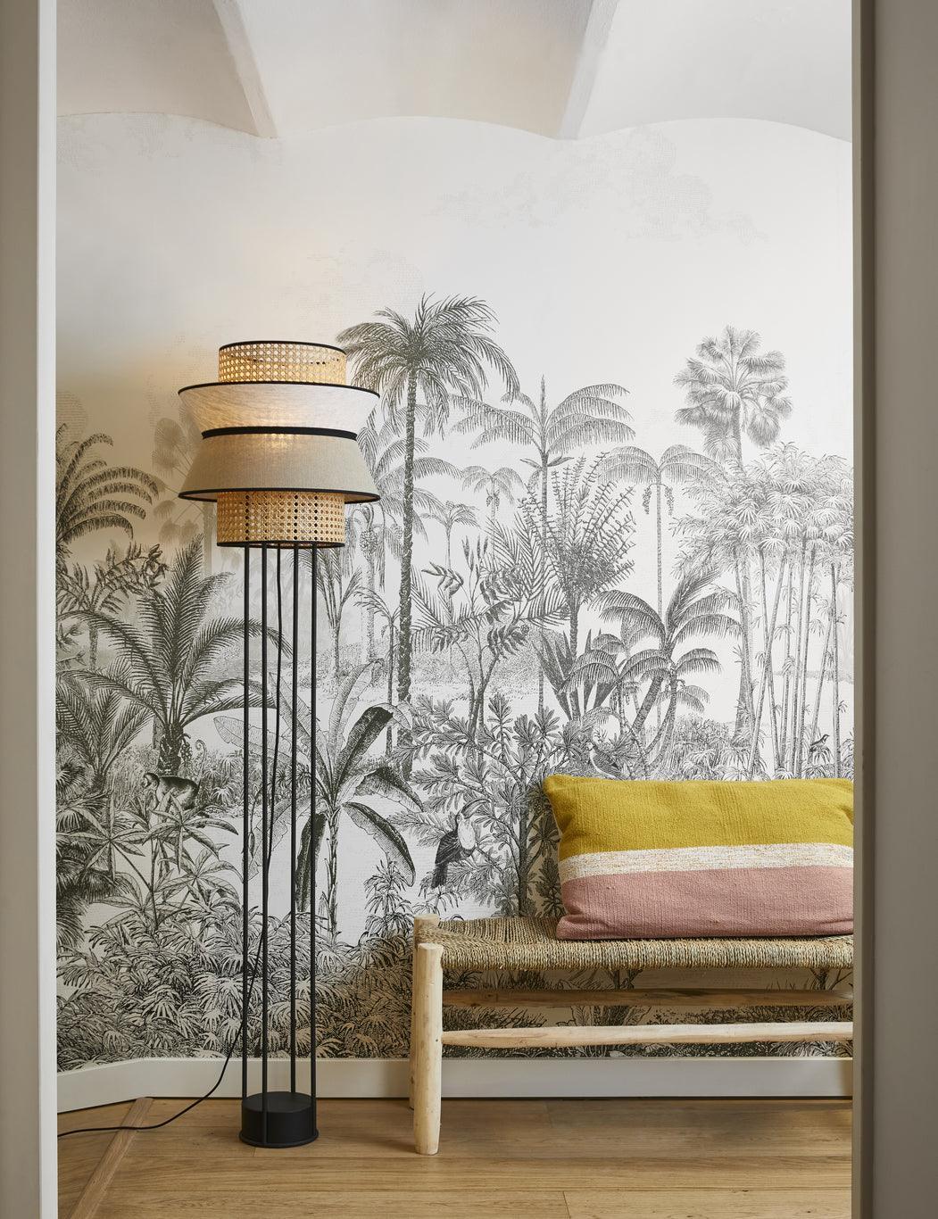 Bodenlampe Singapur 1 in beiger Farbe ist eine metallische Konstruktion, die sandfarben lackiert ist. Ihr Schirm besteht aus gewaschenem Leinen und Schilfrohr, was der gesamten Lampe ein einzigartiges Aussehen verleiht. Sie ist mit einem Textilkabel und einem Fußschalter ausgestattet, was den Komfort bei der Nutzung gewährleistet.