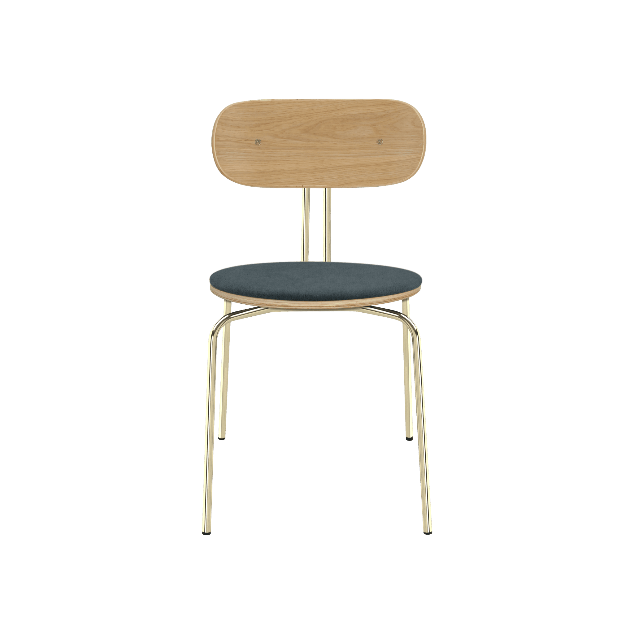 Stuhl Neugierig ist elegant, leichte und minimalistische Möbel aus Eichenfurnier. Es ist mit Messing- oder schwarzen Beinen erhältlich, und das optionale Sitzkissen bietet zusätzlichen Komfort. Sie können ein Kissen aus 17 Farben des Horizons -Stoffes auswählen, die 100% recycelt sind, sowie in einem braunen oder weißen Schatten mit Teddybärenstoff.