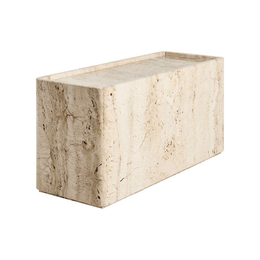 Der Beistelltisch Pietra ist eine raffinierte Hommage an die zeitlose Schönheit von Travertin – einem Naturstein, der seit Jahrhunderten mit seiner einzigartigen Musterung und Struktur fasziniert. Entworfen vom Duo GamFratesi, verbindet Pietra die Monumentalität seiner Form mit subtilen, handgerundeten Kanten, die ihm einen skulpturalen Charakter verleihen. Die leicht erhöhte Kante der Tischplatte schafft eine praktische, tablettartige Oberfläche – ideal zum Präsentieren von Gegenständen oder zum sicheren Abstellen einer Tasse oder eines Glases.