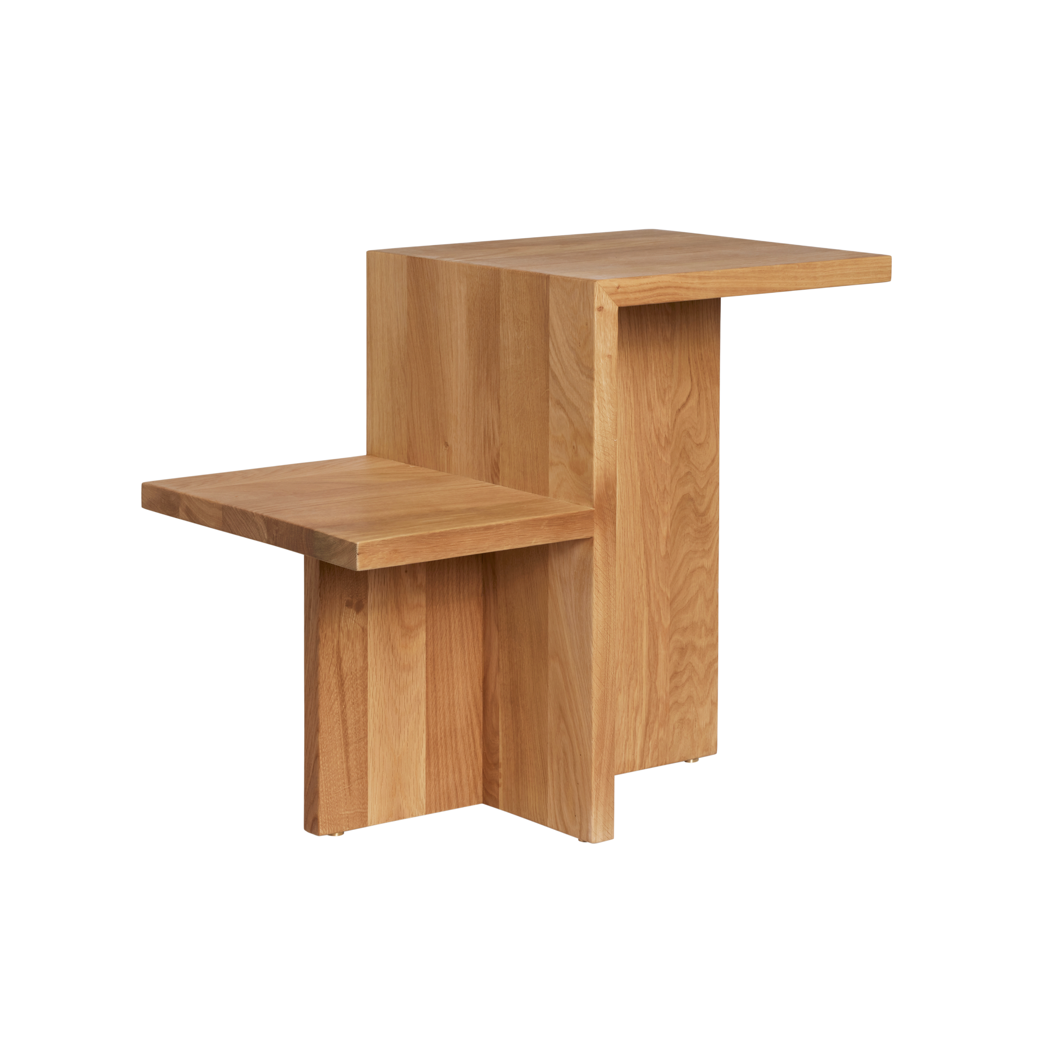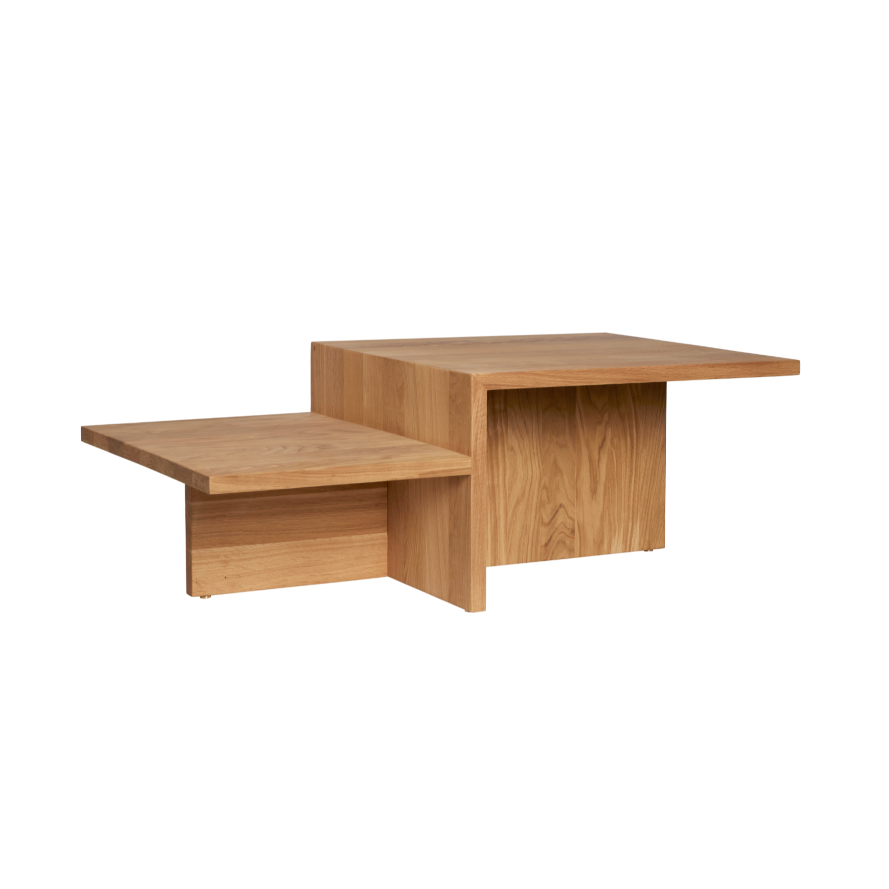 Kaffeetisch Distinct in der Ausführung aus massivem Eichenholz FSC™ ist eine Verbindung von modernem Design mit der natürlichen Wärme edlen Materials. Die architektonische, skulpturale Konstruktion erhält eine neue Dimension durch die Verwendung von geölter Eiche, die dem Raum eine gemütliche Atmosphäre und subtile Textur verleiht. Es ist ein einzigartiges Möbelstück, das minimalistisches Design mit zeitloser Eleganz perfekt kombiniert.