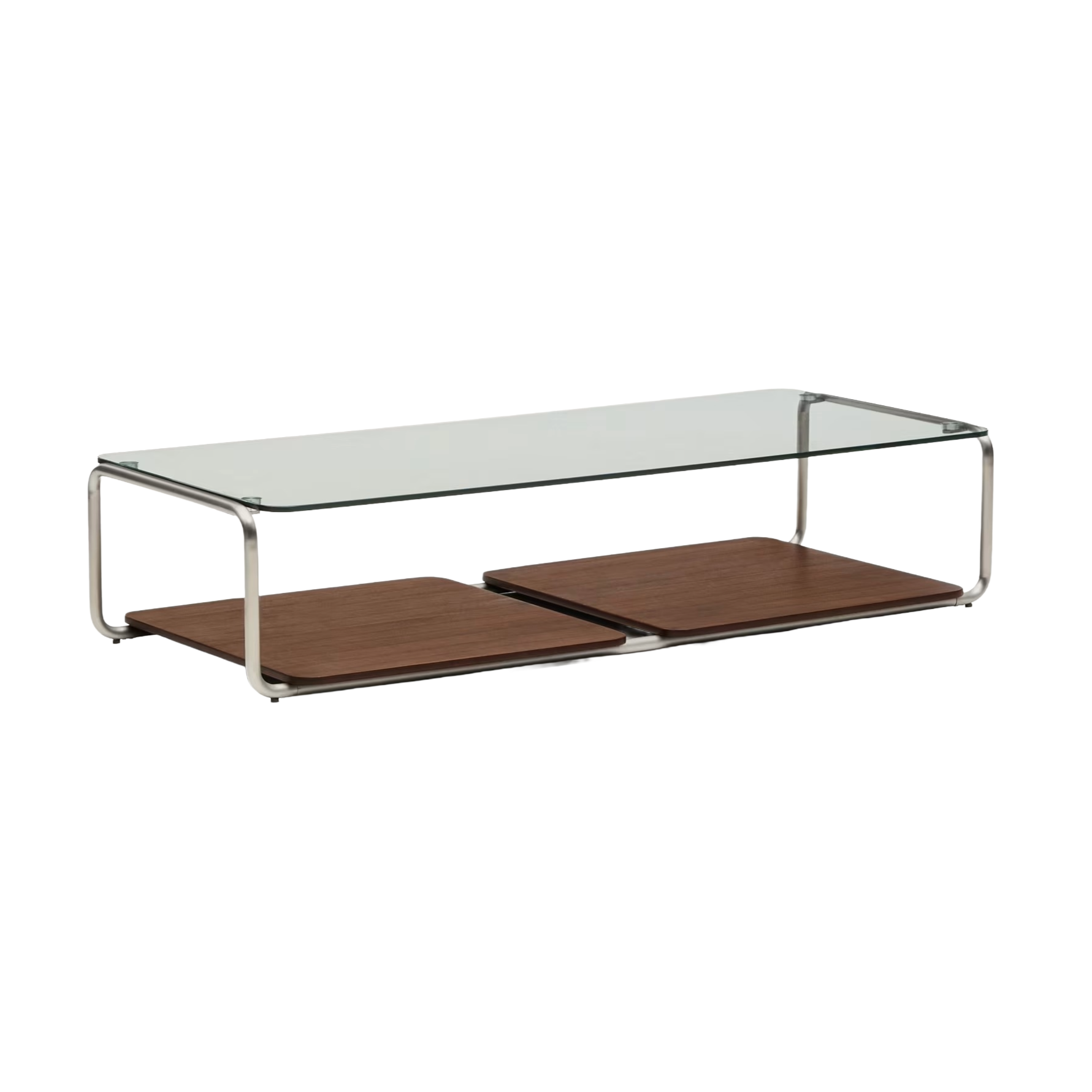 Kaffeetisch Tarsel ist ein Vorschlag für diejenigen, die zeitloses Design und Funktionalität in einem schätzen. Die Kombination aus gehärtetem Glas, dunklem Nussbaumfurnier und gebürstetem Edelstahl verleiht ihm moderne Leichtigkeit und Eleganz. Dieses außergewöhnliche Möbelstück macht den Raum stilvoller und ordentlicher, und dank seiner großen Größe eignet es sich sowohl für die tägliche Entspannung als auch für das Empfangen von Gästen.