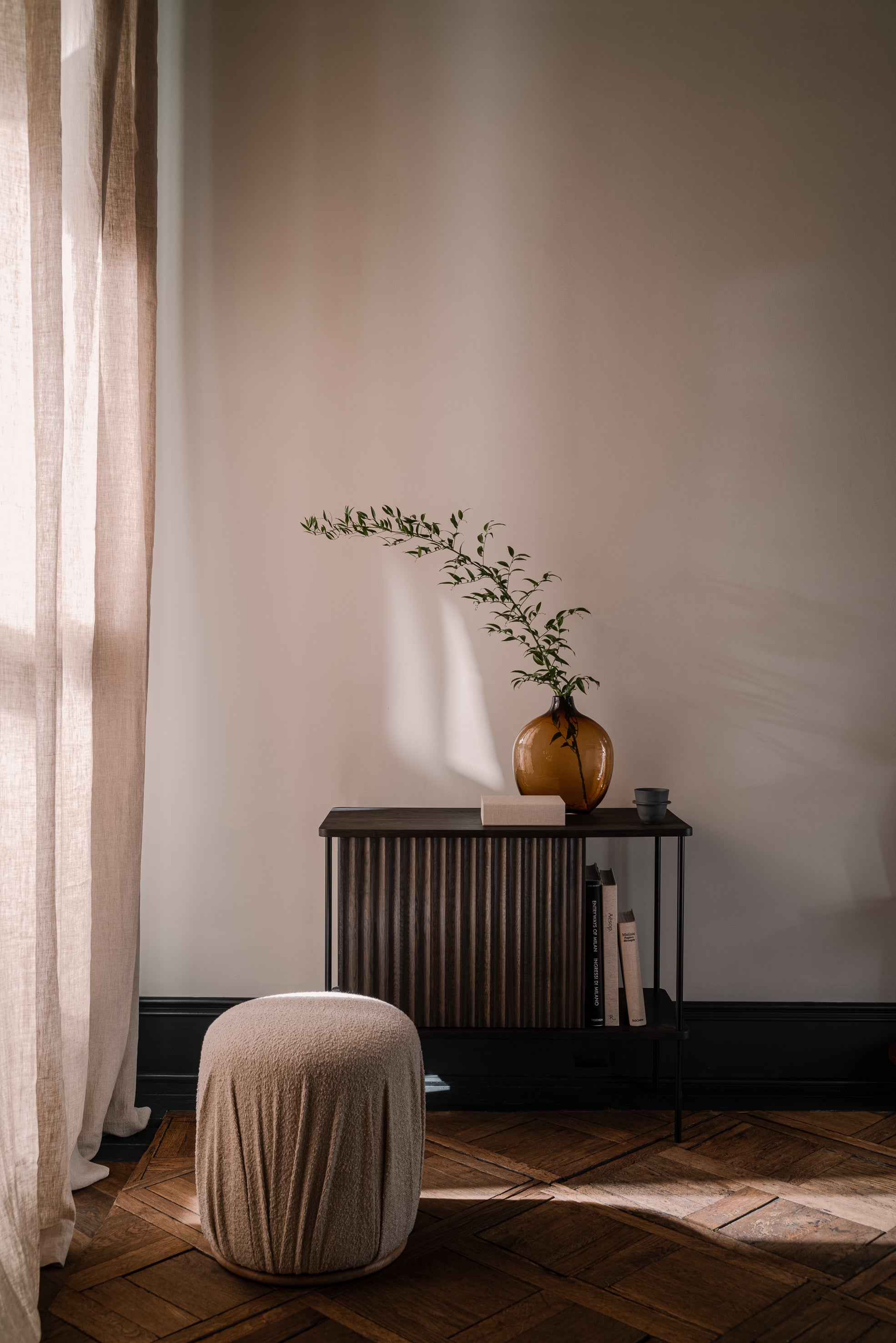 Der Schrank Maya ist ein ausdrucksstück, das skulpturale Form mit funktionalem Ansatz zur Aufbewahrung verbindet. Die charakteristische, gerillte Front mit wellenförmigem Muster zieht die Blicke an und verleiht dem Raum einen einzigartigen Rhythmus, während der Kontrast zwischen der Wärme des Massivholzes und dem kühlen Stahl dem Gesamtbild einen besonderen Ausdruck verleiht. Das seitliche Regal wurde mit Blick auf Musikliebhaber entworfen – es bietet perfekten Platz für einen Plattenspieler und eine Sammlung von Schallplatten und schafft so eine ästhetische und praktische Audiozone.