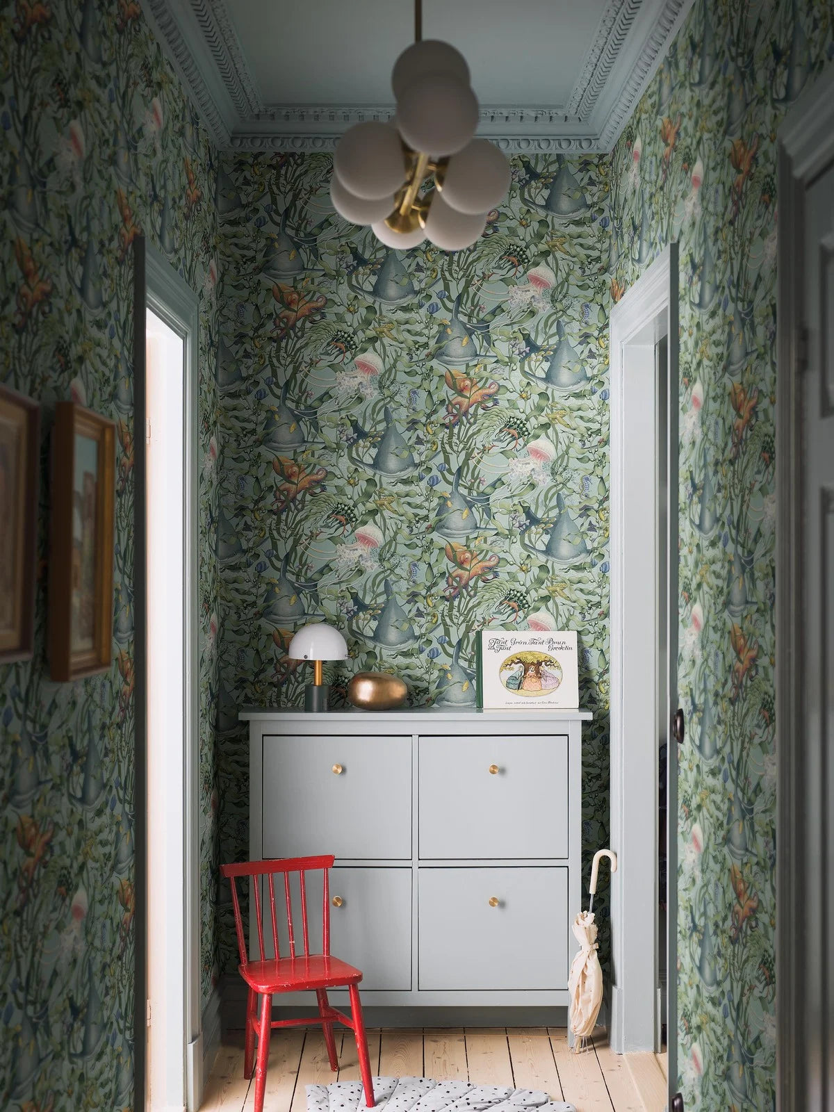 Der zeitlose Charakter der Tapete Underwater Magic macht sie zur idealen Dekoration im Kinderzimmer, die Entspannung und kreatives Spielen unterstützt. Die ruhige Komposition und die durchdachten Details schaffen ein freundliches Ambiente, in dem Ihr Kind entspannen, träumen und die faszinierende Welt des Ozeans entdecken kann.