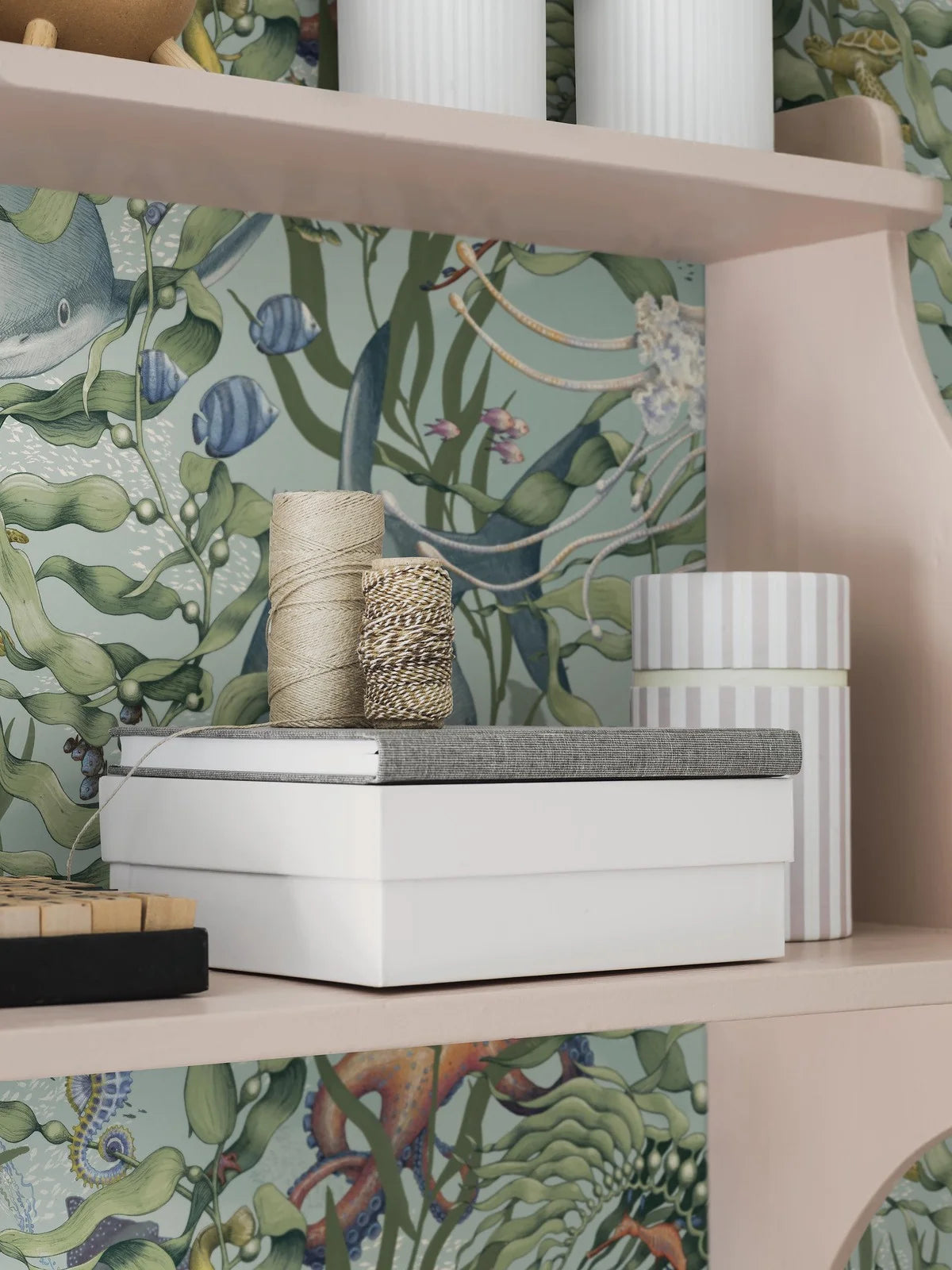 Tapete Underwater Magic entführt Sie in die ruhige und geheimnisvolle Welt der Unterwasserwelten und schafft eine beruhigende und fesselnde Atmosphäre. Das zarte Motiv der wogenden Algen enthüllt verborgene Meeresbewohner wie Seepferdchen und Riffhaie und regt die Fantasie und Neugier Ihres Kindes an. Tapete begeistert mit einem subtilen, von der Natur inspirierten Muster und ermöglicht es, einen harmonischen Raum zu schaffen, der zur Entspannung einlädt.