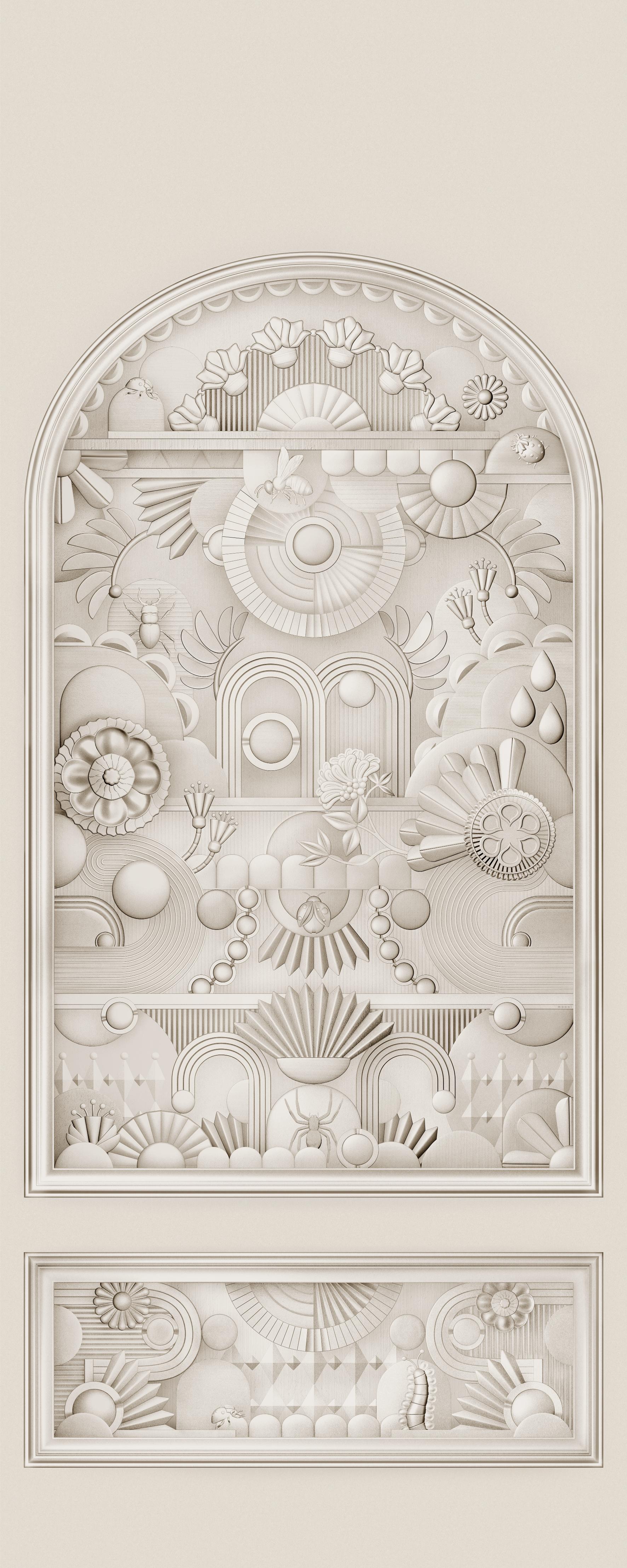 Mural Greenhouse Gathering Arch ist eine außergewöhnliche Wanddekoration, inspiriert von dekorativer Stuckkunst und der Ästhetik des Art Deco. Die monochrome Komposition erinnert an klassische Gipsformen und architektonische Details und schafft einen Effekt subtiler Eleganz. Das Motiv spielt auf den Blick durch die Glasfenster eines Gewächshauses an und enthüllt den Reichtum üppiger Blumen und dekorativer Strukturen, wodurch das mural perfekt in luxuriöse und zeitlose Inneneinrichtungen passt.