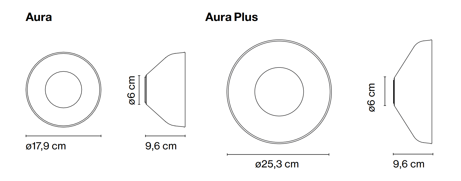 Die Aura ist in zwei Größen - 18 und 25 cm Durchmesser - erhältlich, um Beleuchtungslösungen für kleinere oder größere Räume bereitzustellen. Diese leichte und starke Wandlampe sollte in einem idealen Verhältnis zum Innenraum sein, das zu beleuchten ist, und der Anteil hängt immer von der Skala ab.