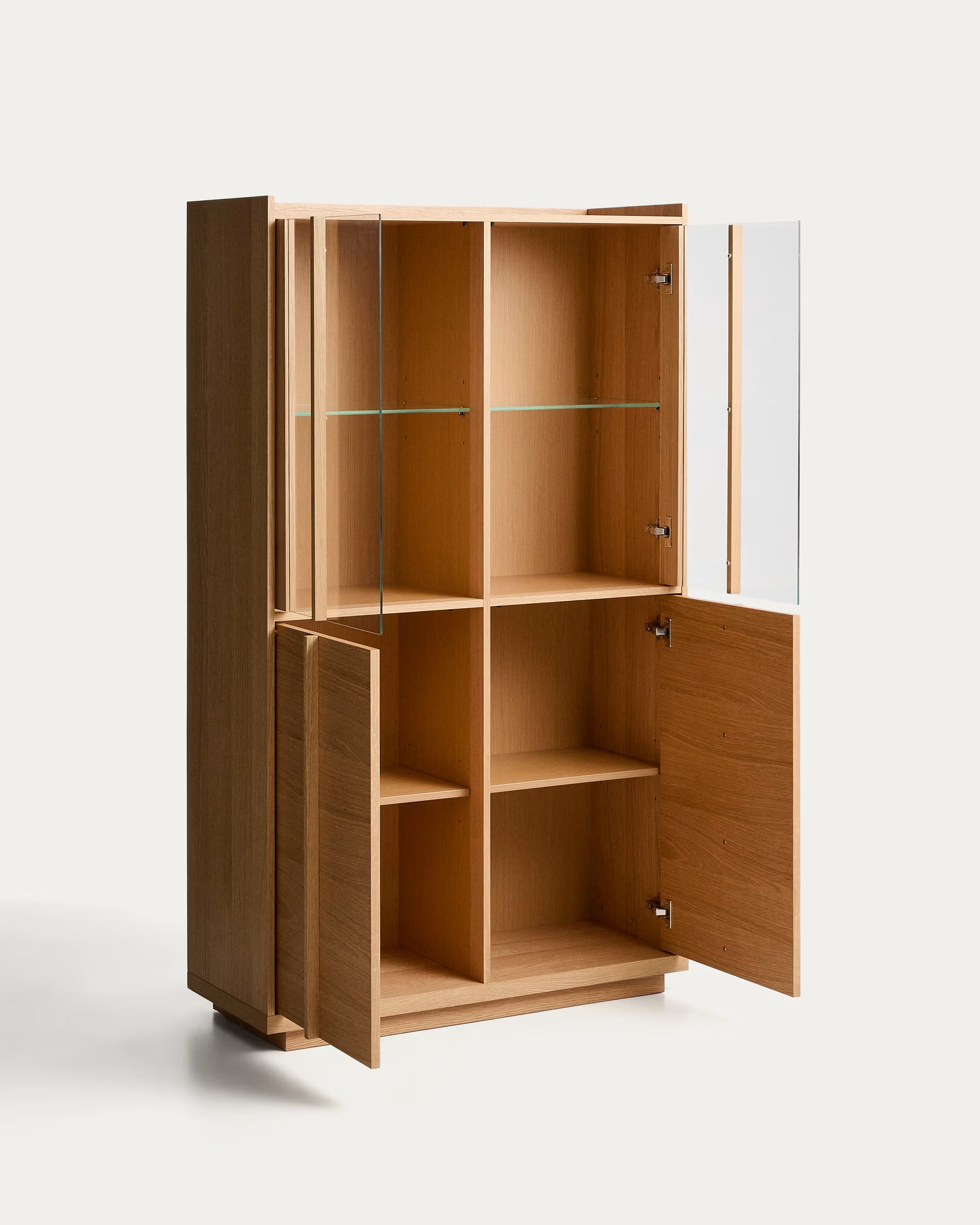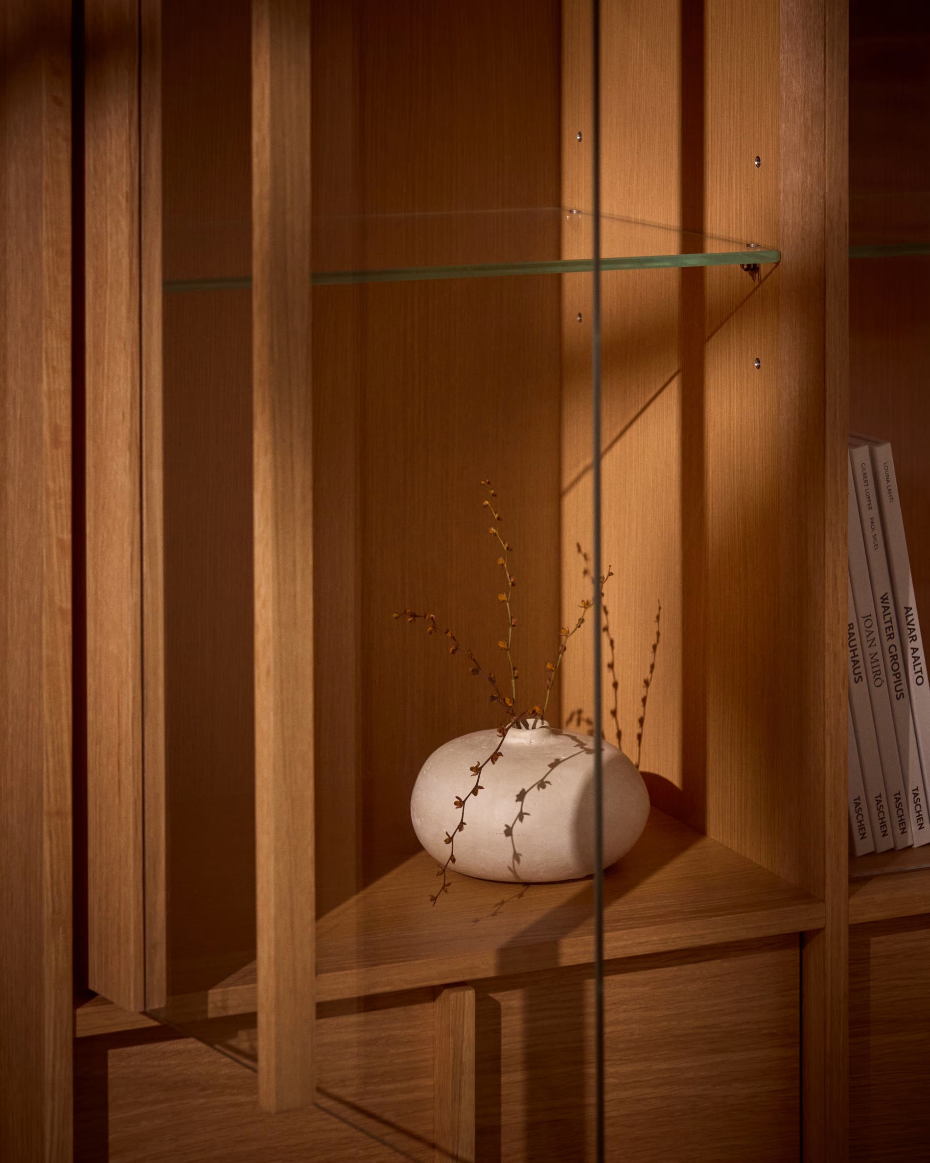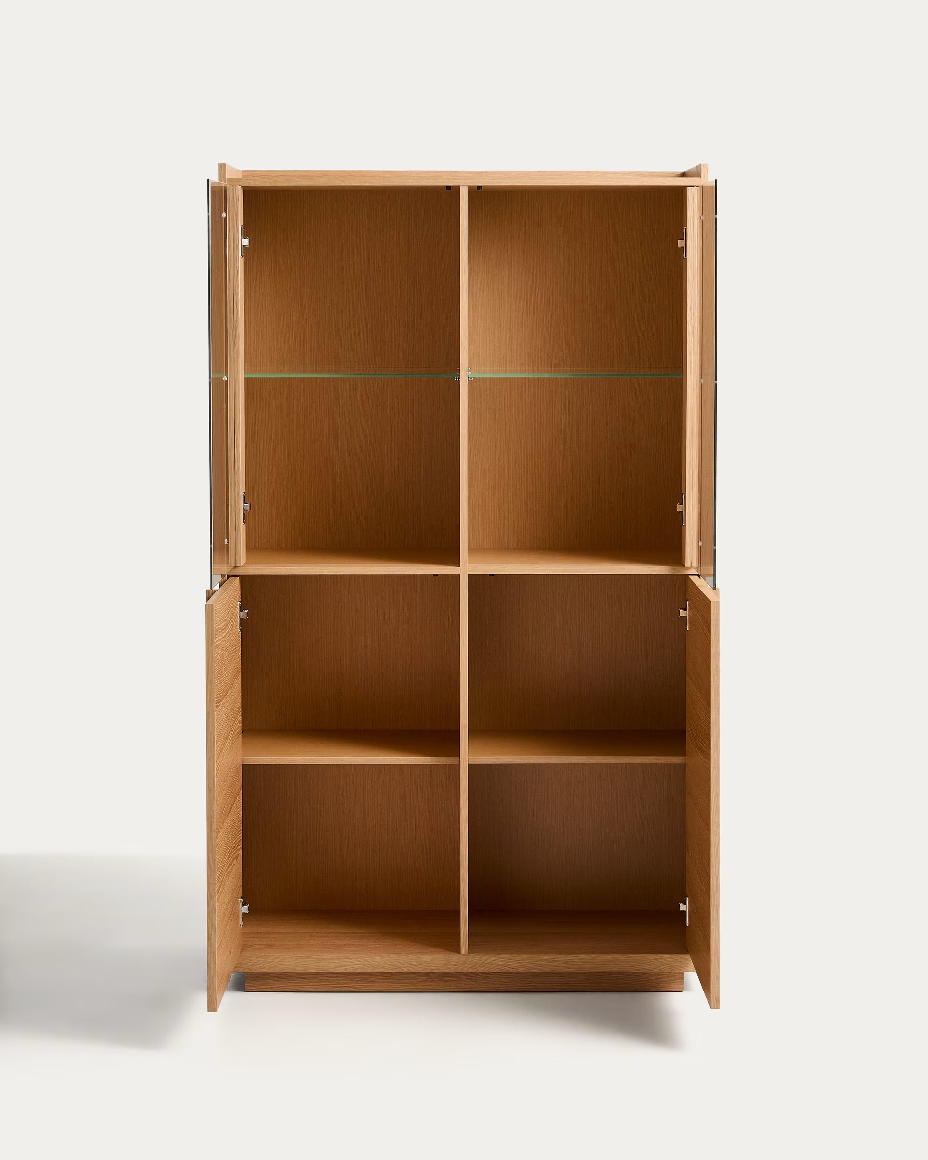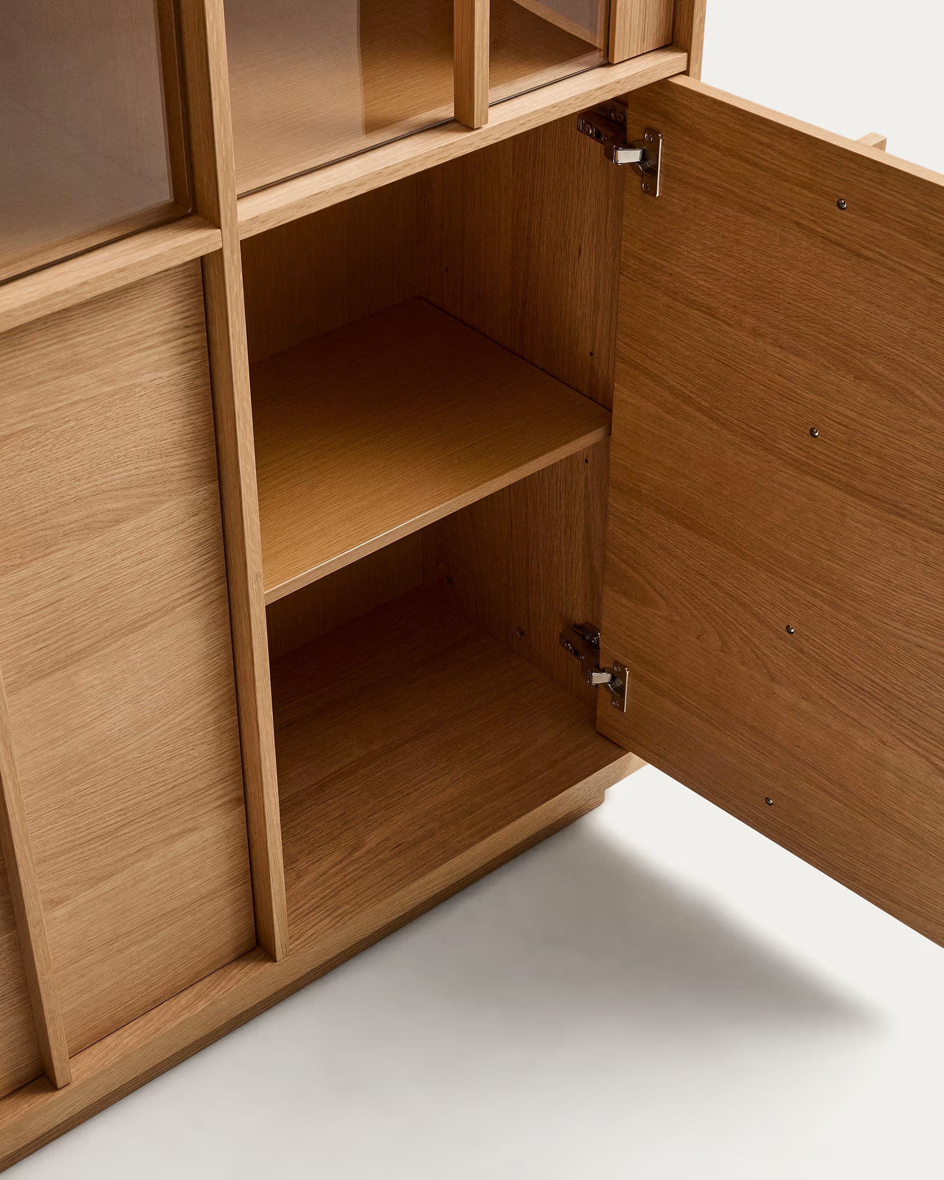 Die durchdachte Konstruktion vereint Funktionalität mit Ästhetik – der obere Teil mit verglasten Türen präsentiert Dekorationen ideal, während der untere Teil praktischen Stauraum bietet. Vier Türen mit einem System für sanftes Schließen und verstellbaren Scharnieren garantieren Komfort in der Nutzung, und die verstellbaren Regale ermöglichen es, das Innere an individuelle Bedürfnisse anzupassen. Diese stilvolle Vitrine für das Wohnzimmer oder Esszimmer verbindet hohe Verarbeitungsqualität mit einem verantwortungsvollen Produktionsansatz durch die Verwendung von FSC-zertifiziertem Holz.