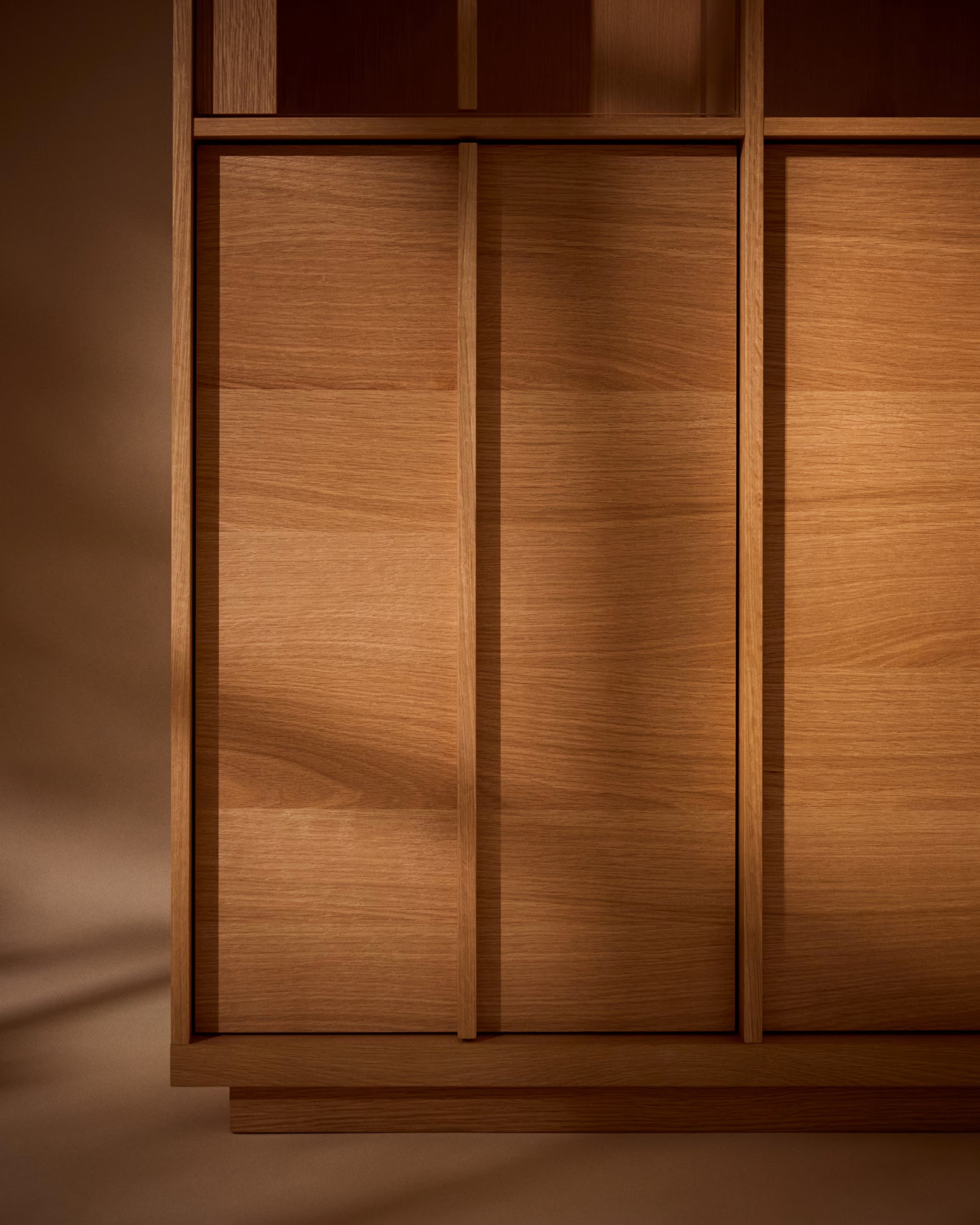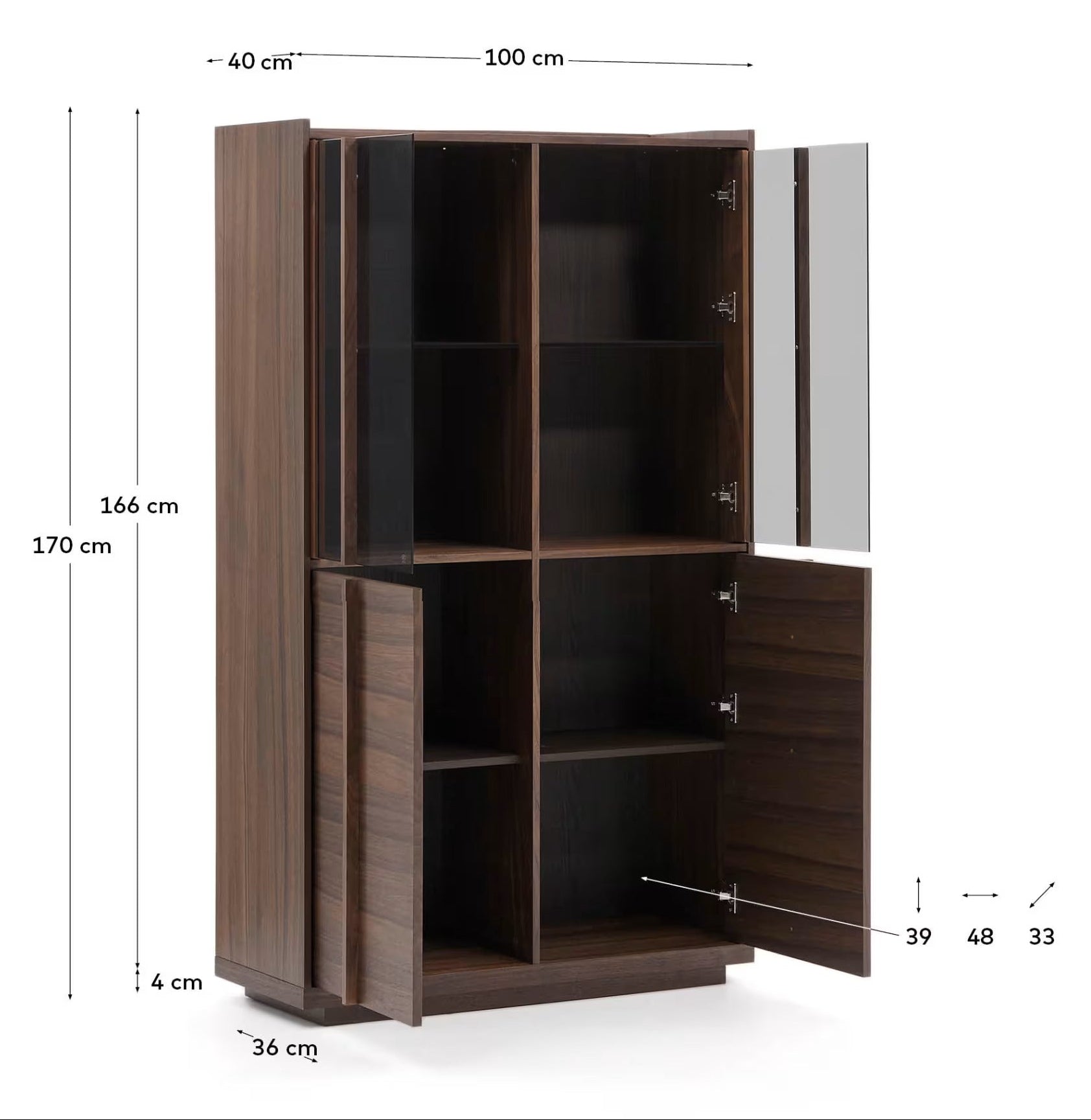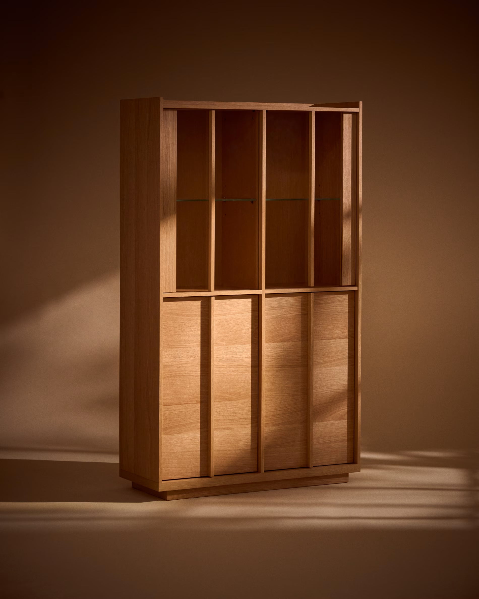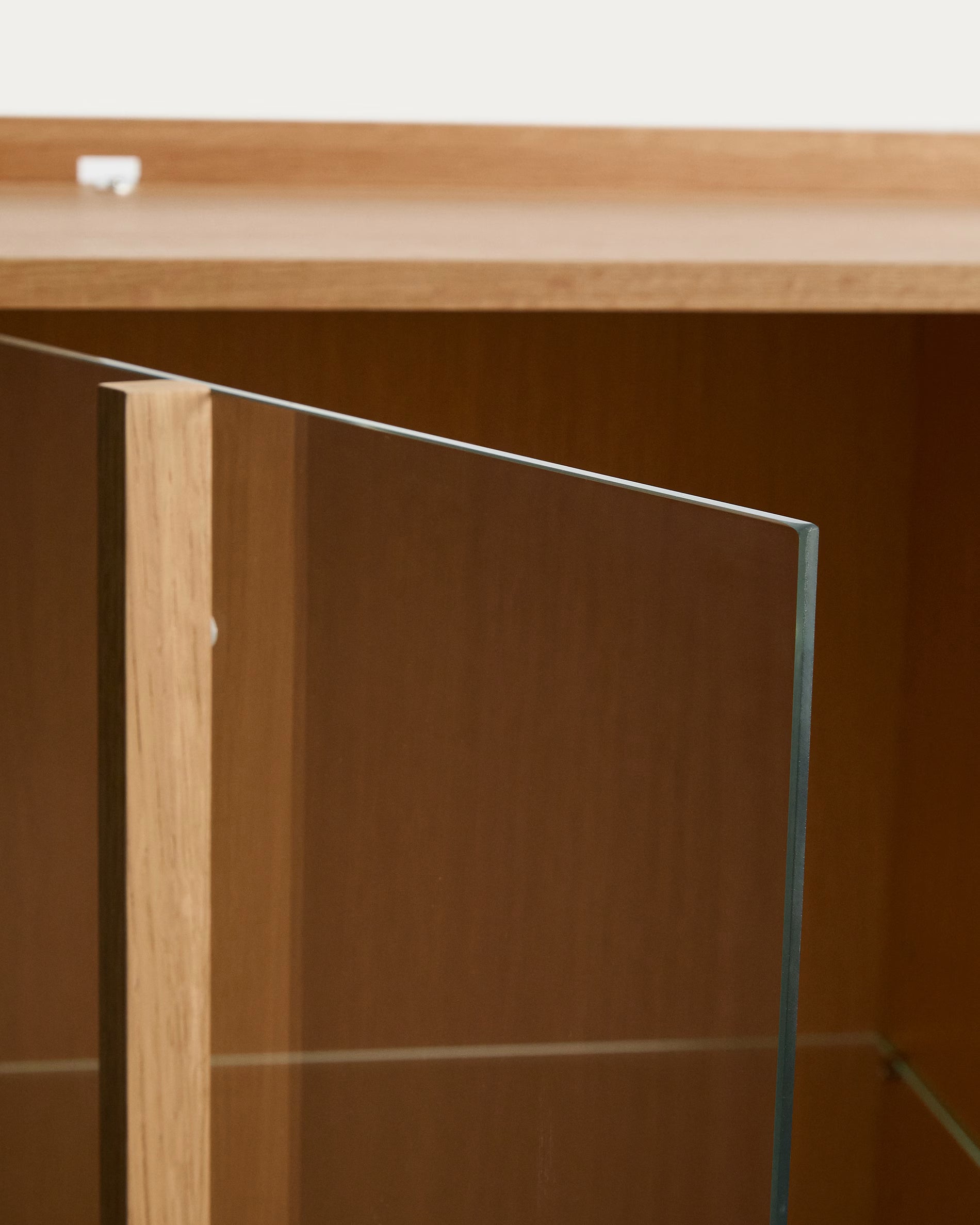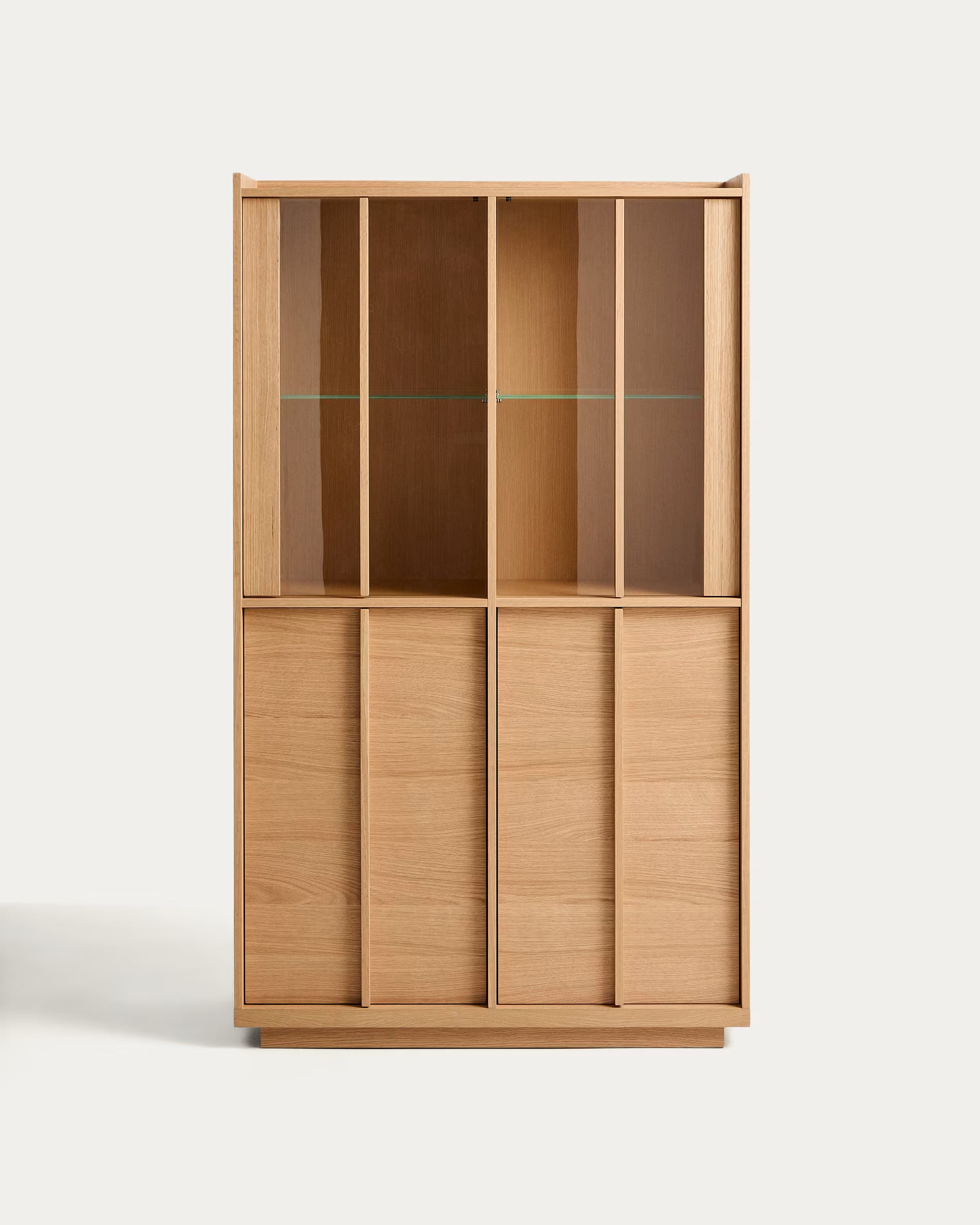 Die durchdachte Konstruktion vereint Funktionalität mit Ästhetik – der obere Teil mit verglasten Türen präsentiert Dekorationen ideal, während der untere Teil praktischen Stauraum bietet. Vier Türen mit einem System für sanftes Schließen und verstellbaren Scharnieren garantieren Komfort in der Nutzung, und die verstellbaren Regale ermöglichen es, das Innere an individuelle Bedürfnisse anzupassen. Diese stilvolle Vitrine für das Wohnzimmer oder Esszimmer verbindet hohe Verarbeitungsqualität mit einem verantwortungsvollen Produktionsansatz durch die Verwendung von FSC-zertifiziertem Holz.