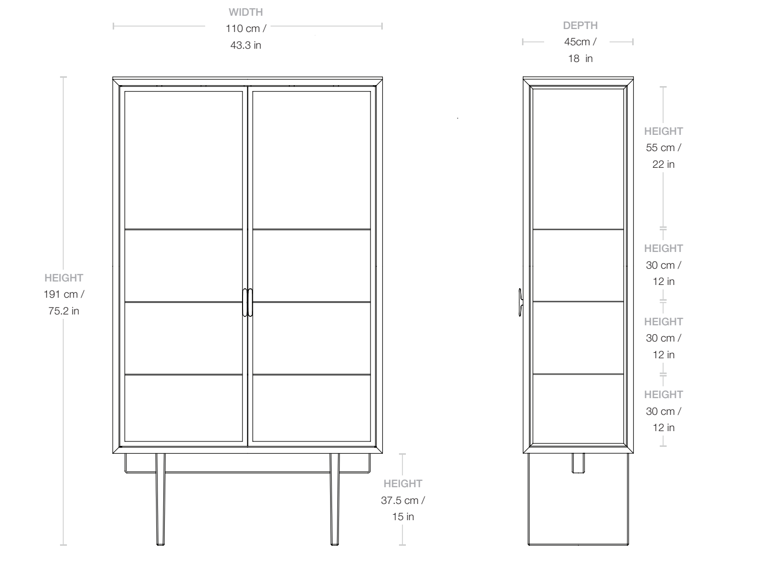 Erhältlich in zwei Ausführungen – naturbelassene Eiche und dunkel gefärbte Eiche – eignet sich die Vitrine sowohl für das Wohnzimmer, das Esszimmer als auch für das Schlafzimmer oder die Küche. Sie kann auch als elegantes Möbelstück in öffentlichen Räumen wie Hotel-Lobbys oder Büros dienen. Messinggriffe und präzise Details verleihen dem Gesamtbild zeitlose Eleganz und Klasse.