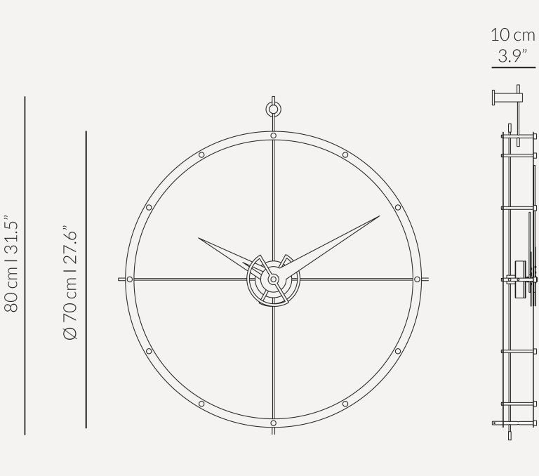 Materiały: stal nierdzewna lub drewno orzechowe (obręcz), chromowany lub polerowany mosiądz (detale), lite drewno orzechowe (wskazówki), mechanizm UTS German