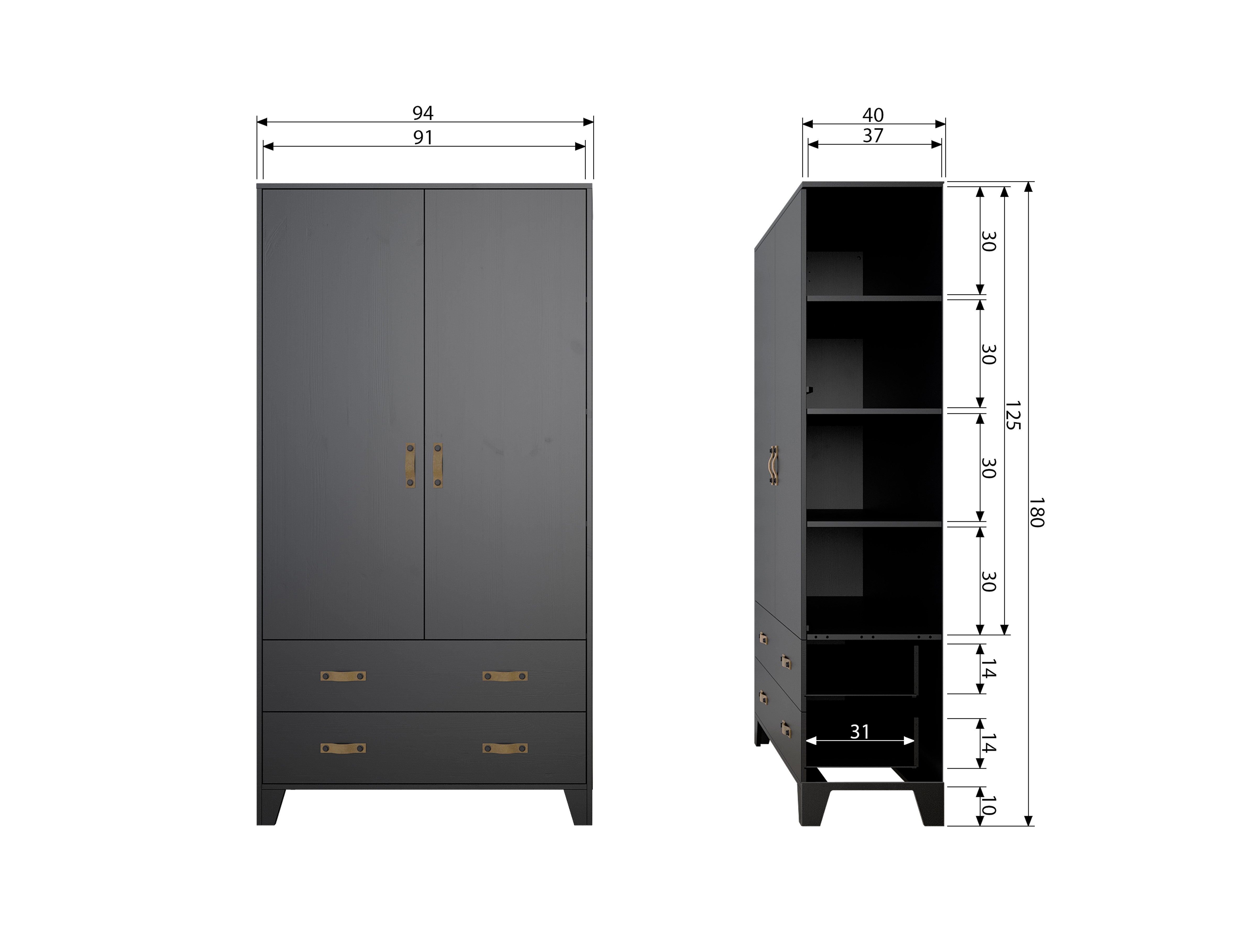 The black Dian wardrobe is made from durable materials that ensure its longevity and durability. Two doors open easily, revealing a storage space that is spacious enough to hold everything you need - from clothes to bedding or towels. Additionally, the wardrobe is equipped with two practical drawers that allow for even better organization and storage of small items.
