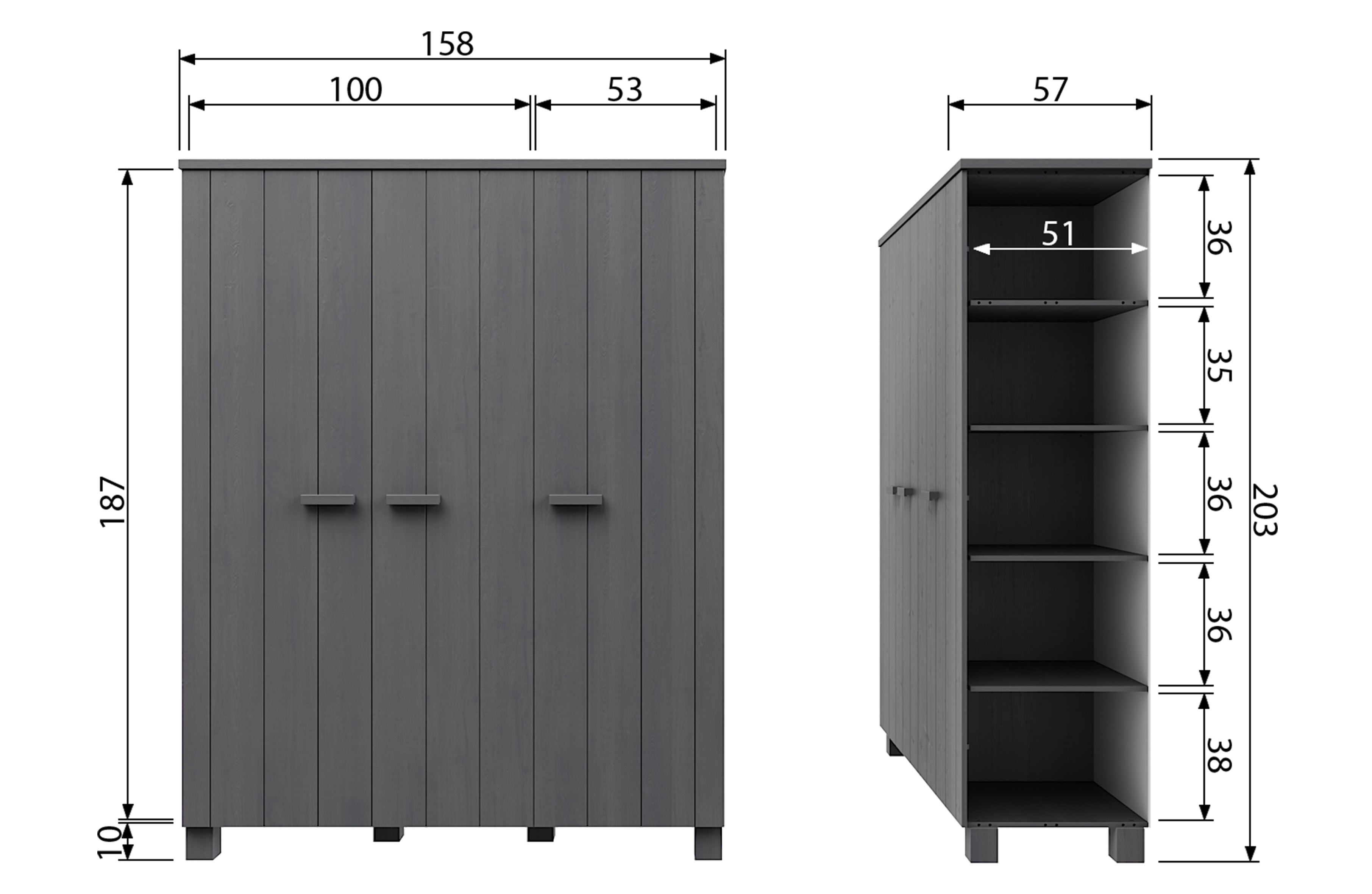The Dennis wardrobe is made from durable materials that ensure its longevity and durability. Three doors open easily, revealing a storage space that is spacious enough to hold everything you need - from clothes to bedding or towels.