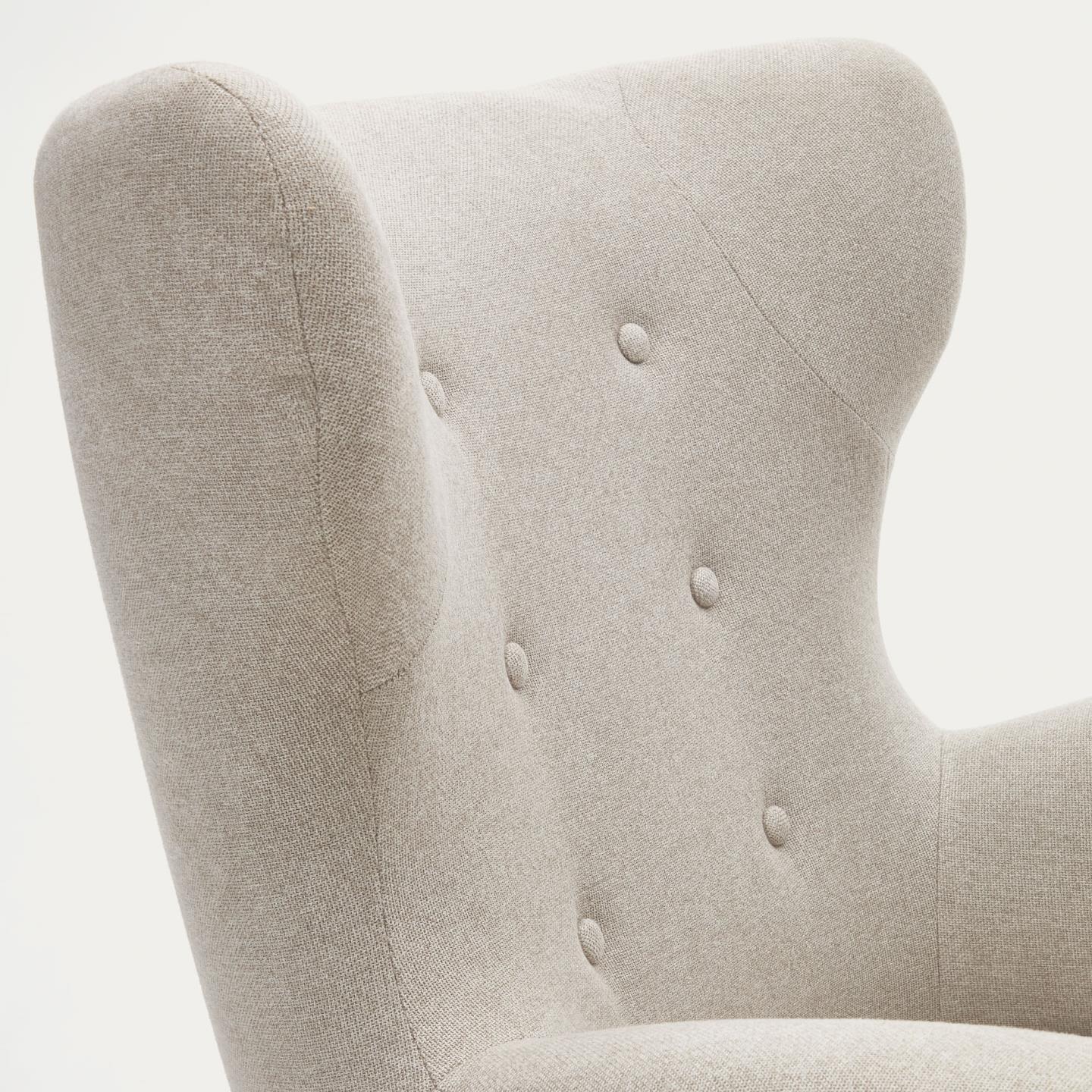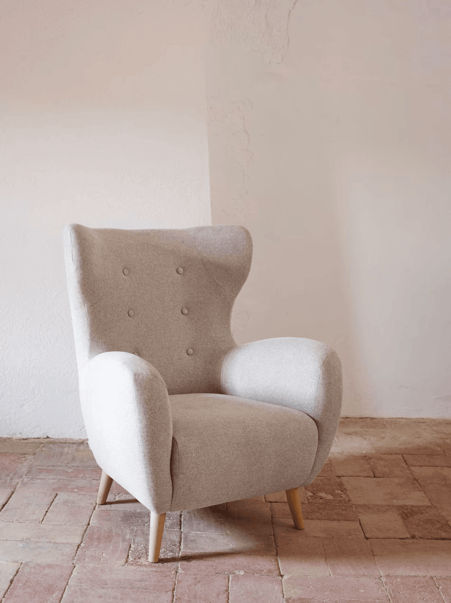 Chair Patio is not just a piece of furniture; it is a journey back in time to the retro design of the wing chair from the 1960s, enriched with modern details. The classic shape of the wing chair meets elegant details, such as buttons on the back in capitonné style and solid legs made of beech wood.