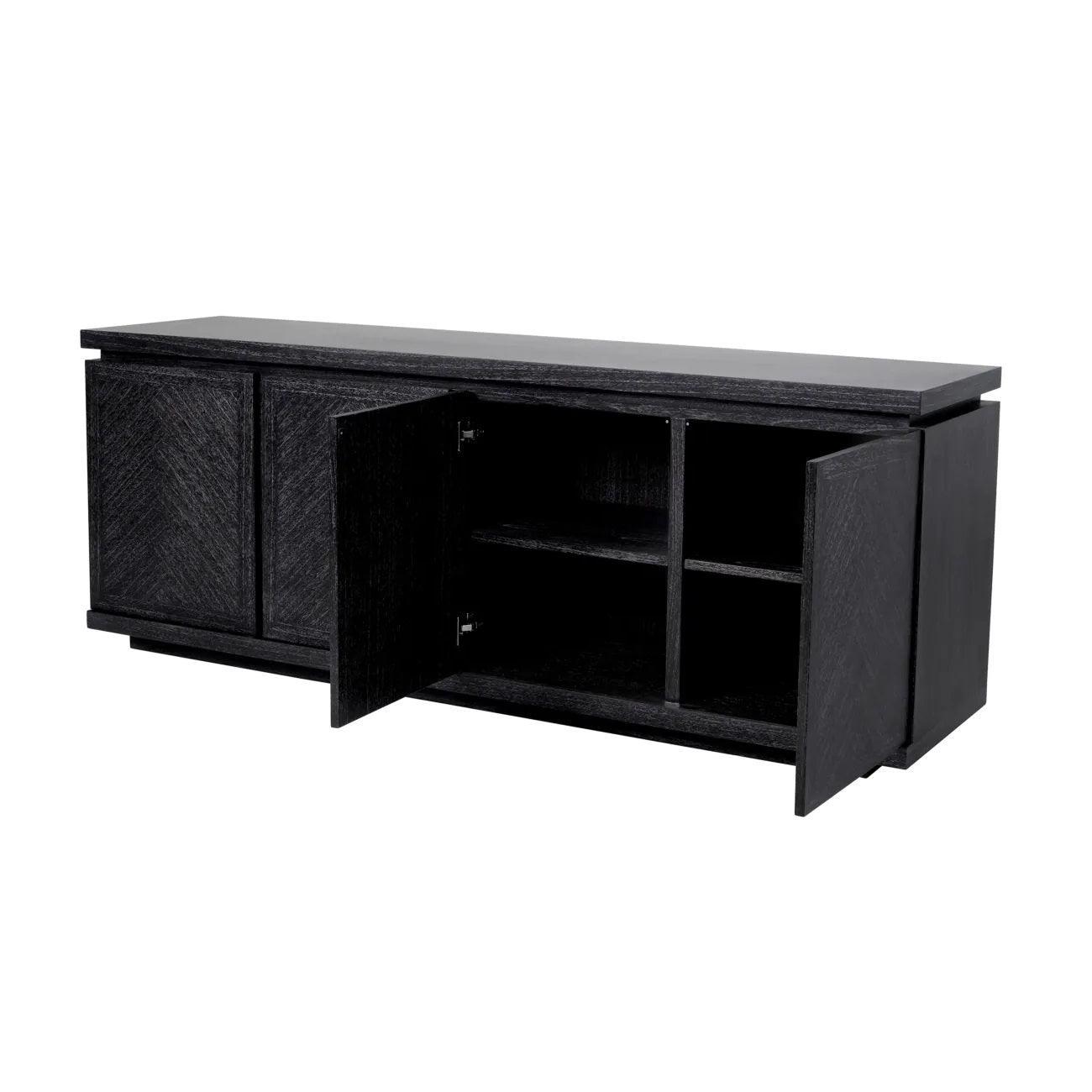 Bowen is more than just a piece of furniture, it is a sophisticated combination of design and practicality. Graphite-gray oak veneer gives the dresser a modern and subtle luxurious look that harmonizes with various interior arrangements. This combination of elegance and functionality creates a sideboard, which will not only accommodate, but also attract looks. Four doors without handles are not only a practical solution, but also an element of sophisticated design. Unique designs with herringbone on the door surface add a dresser character and uniqueness. These are details that are impressive to create a composition that attracts attention.