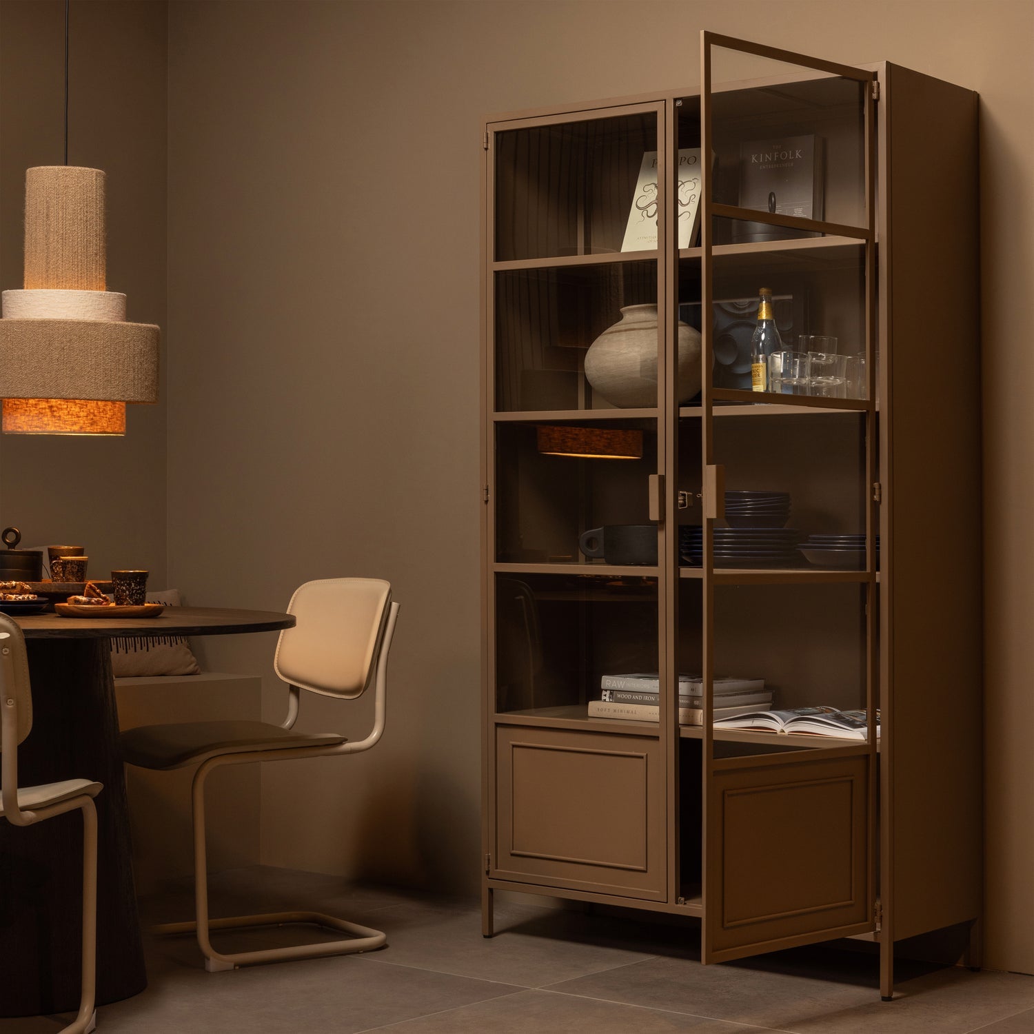 Made of powder -painted metal, site Ronja combines durability with aesthetics. The matte finish adds its elegance, and capacious shelves offer a lot of storage space. The glazed door exposes the contents without overwhelming the space.