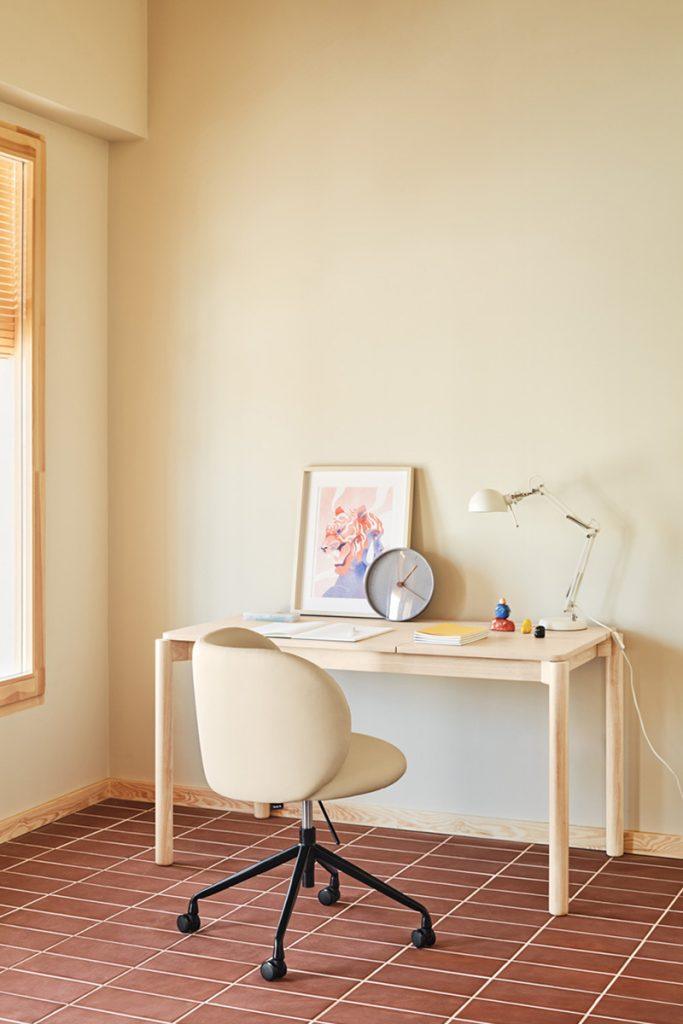 Chair on wheels In a brick color called Mogi, he refers to a Korean word marking a mosquito. This unique seat impresses with its elegant design with timeless shapes. Thanks to the surrounding shape that ensures a feeling of peace and convenience, it becomes an ideal place to rest.