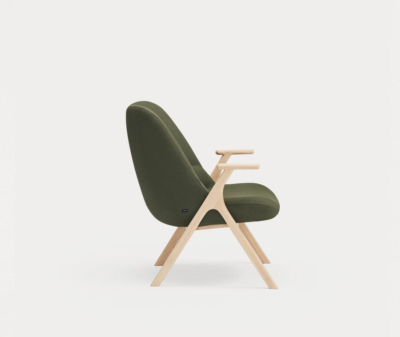 Armchair Dins in a dark green color is a piece of furniture that combines two opposing concepts that coexist in the harmony of proportion. The delicacy and warmth of the wooden Dins chair structure are fully integrated with a spacious upholstered body.