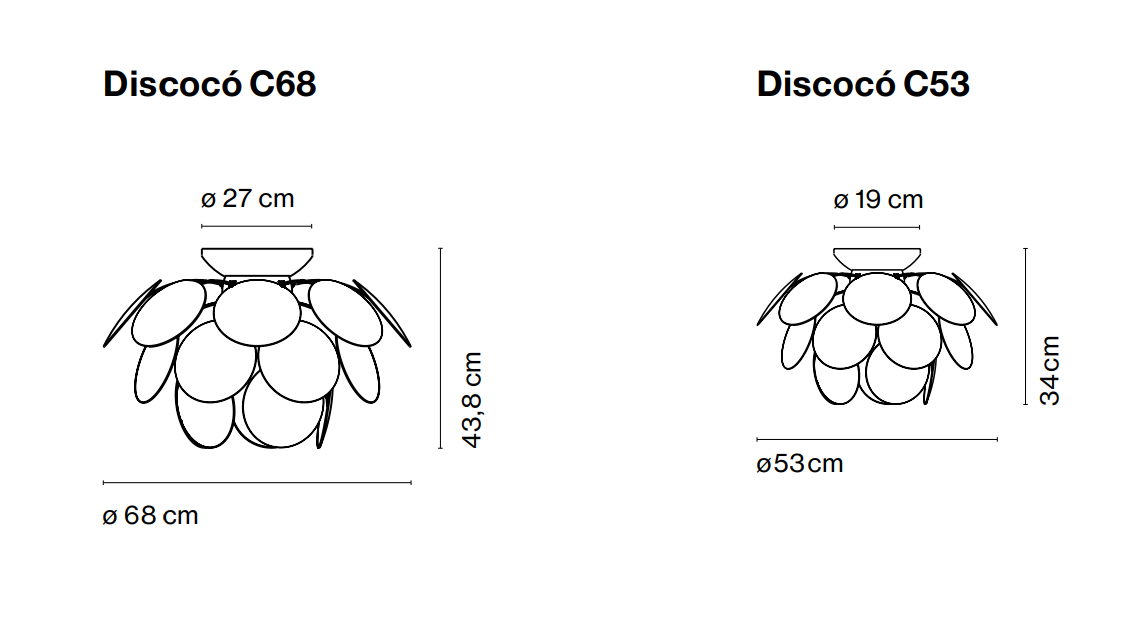 Additional reflections are reflected from the chrome hemisphere, to which the disks are attached. After turning off Discocó is a stunning object that catches the eye and fills the space. Available in white and gold-black in 2 different sizes.