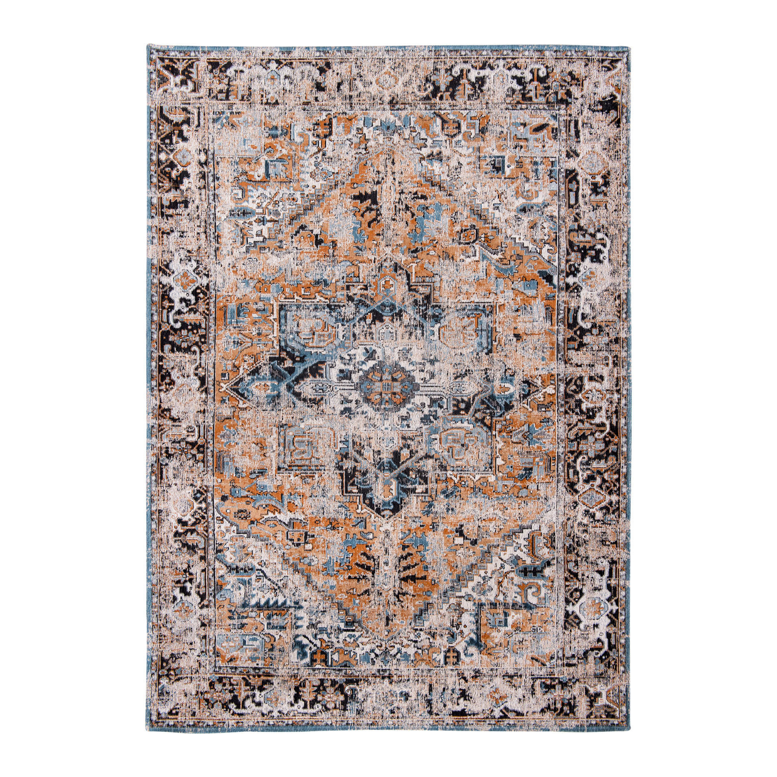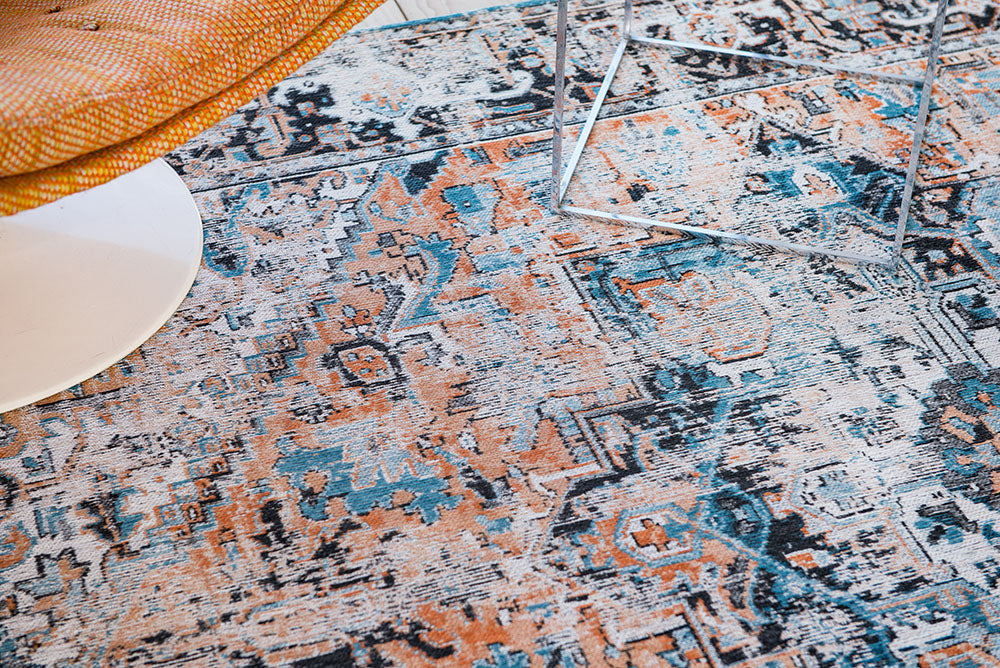 Classic orange-blue Vintage rug Seray Orange will certainly delight you with its expressive design. Inspired by oriental patterns, this rug combines warm shades of orange with cool tons of blue, creating a harmonious composition of colors that will enliven any interior. Delicate, spatial patterns give him elegance and depth, creating a subtle play of the lights on its surface.