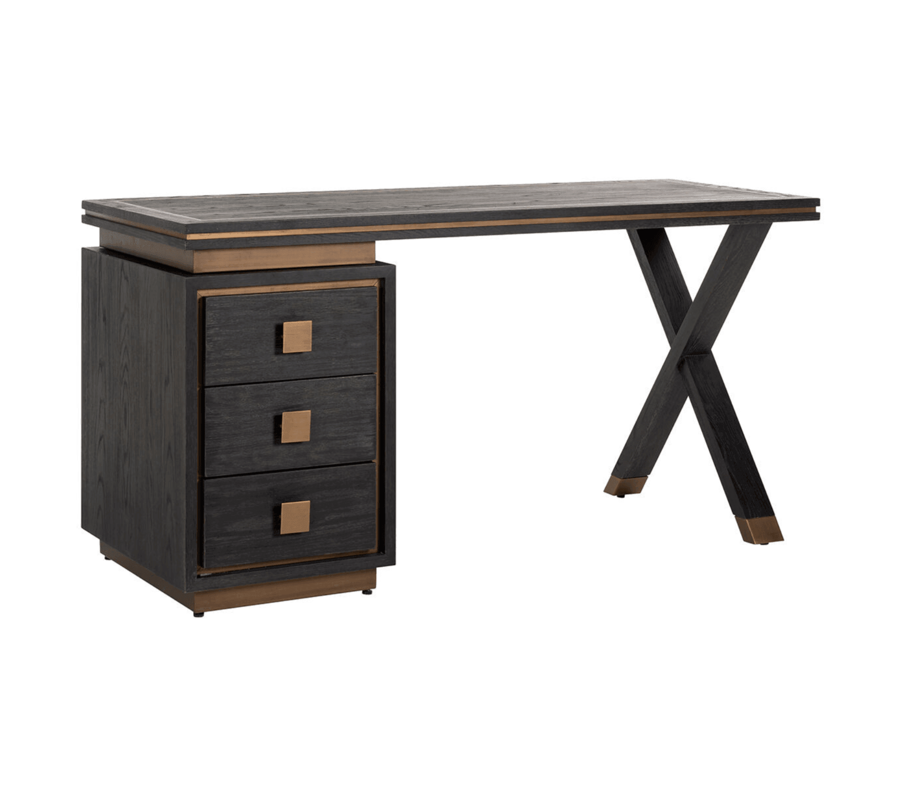 The desk is designed for aesthetics and functionality. Three closed drawers are the perfect solution for storing various objects, and their contrast with a transverse leg adds a unique character and depth to the furniture. The stylish desk top is decorated with brass accents, which gives it elegance and unique charm.