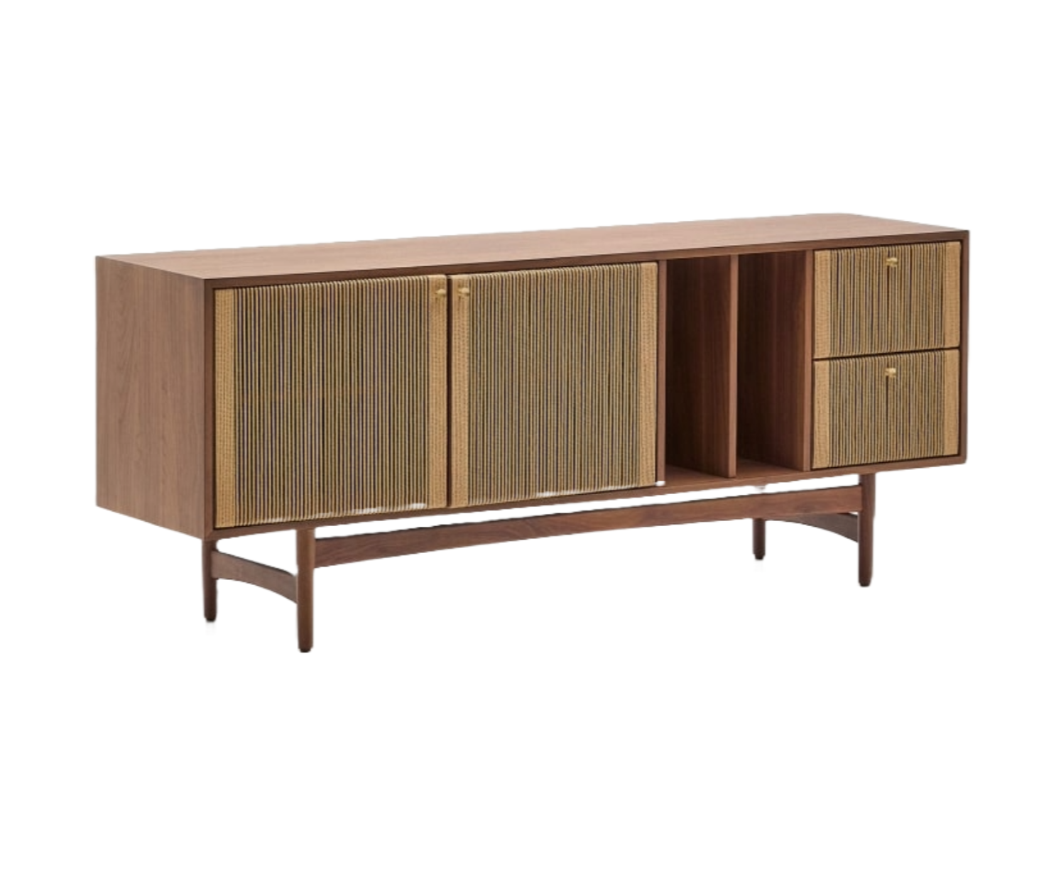 Made from walnut veneer and solid wood legs, the sideboard features doors with details made of hand-woven paper rope. It offers three doors with a soft-close system and adjustable hinges, equipped with brass handles, as well as two drawers on hidden rails. Additionally, the sideboard has an open storage space with a vertical divider, and adjustable feet ensure stability on uneven surfaces.
