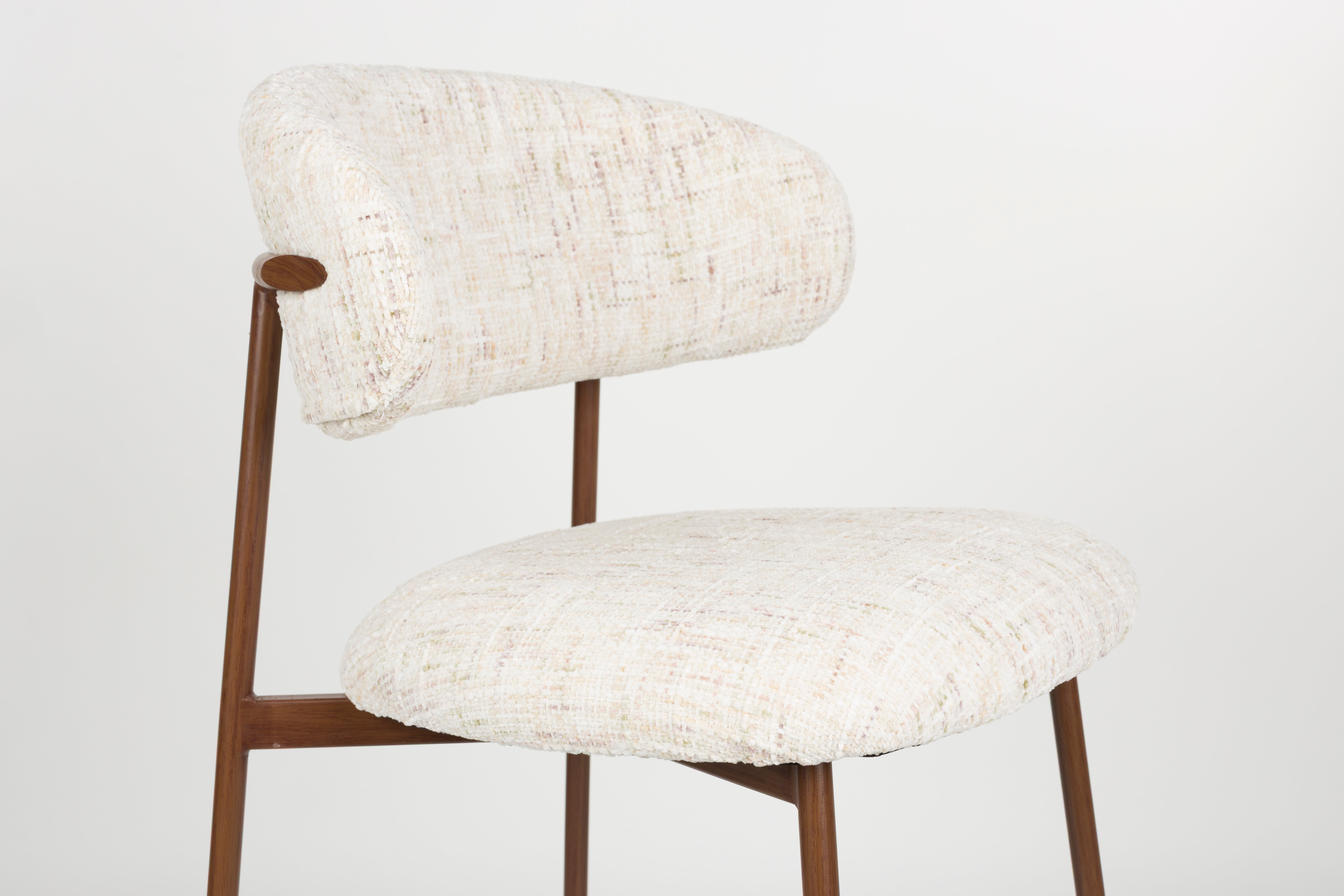 The deep, walnut finish of the wooden base creates a striking contrast with the fabric, making the chair harmoniously blend classic references with modern trends. The stable iron construction and excellent ergonomics ensure comfort even during prolonged use. It’s a functional and stylish addition that is perfect for a kitchen island, high table, or elegant dining room.