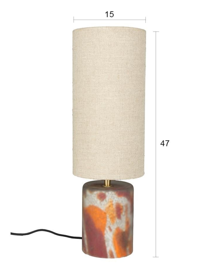 Modern table lamp Earl is a designer accessory that can transform the character of your interior and introduce a warm, cozy atmosphere. Its matte glass is adorned with a multicolored pattern in warm tones, reminiscent of watercolor painting. This gives the lamp an artistic and slightly eccentric character, perfectly echoing the vibe of the 70s. The elongated shade made of lightweight, woven fabric gently diffuses the light, creating a moody glow in the room.