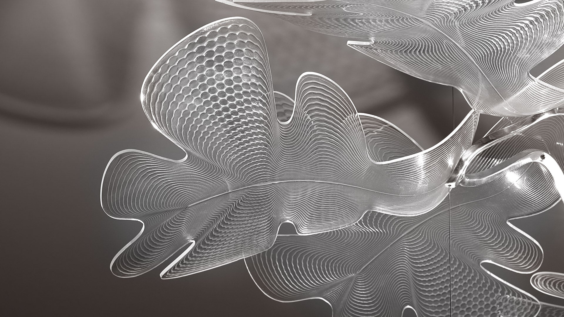 Chandelier Chlorophilia 2 is an evolution of the esteemed design by Ross Lovegrove, creating a lighting installation inspired by the geometries of nature. This model doubles the light-diffusing surfaces, introducing an even more spectacular visual effect. When turned on, the lamp emits indirect light that is refracted and filtered through transparent elements resembling leaves – creating a mesmerizing light projection on the ceiling.