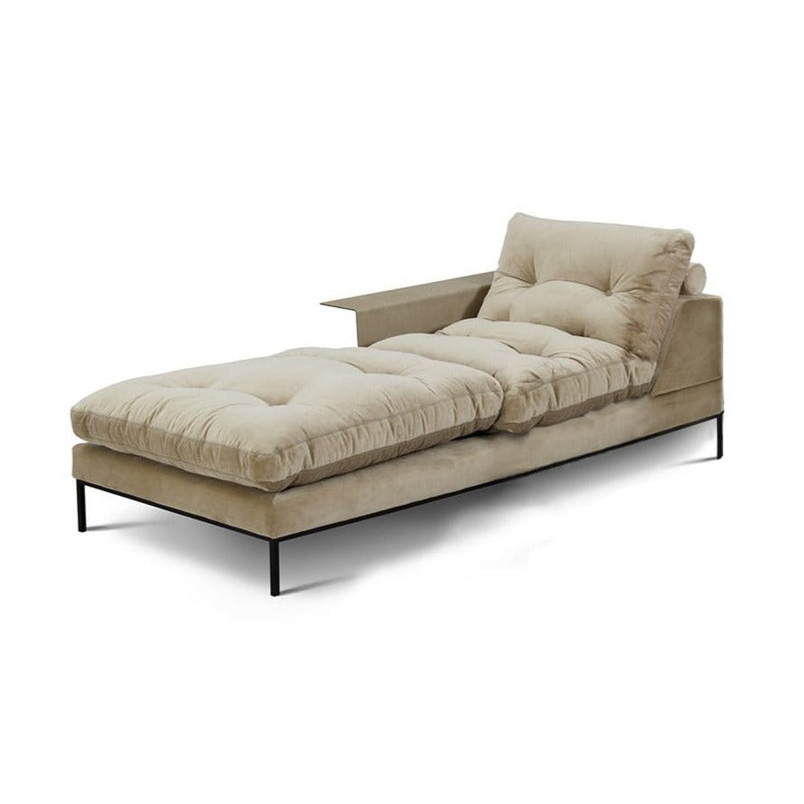 As part of its functional and decorative accessories, the Study chaise longue also has a shelf that allows for the storage of books, magazines, remotes, or for placing drinks during an evening movie session. The shelf is made of metal and can be finished with cork, PVC rubber, or leather. The Study model looks great in spacious living rooms, where it can be placed centrally to highlight its designer form and functionality.