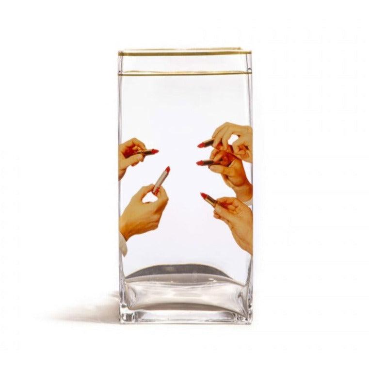 Vase The Lipsticks vase is crafted from high-quality glass, bringing a sense of lightness and freshness to your interior. Its simple and minimalist shape is enhanced by golden accents and a playful graphic depicting hands with red lipsticks. The colorful elements add character to the vase, while the golden details elevate the Lipsticks vase to a new level of elegance. This design is the creation of Toiletpaper Home, a brand known for its unique decor pieces that captivate the eye.