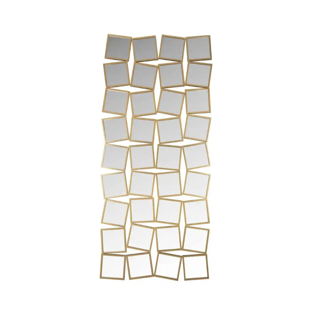 Eye-catching decorative mirror Badia in a golden frame with a geometric pattern is a modern element that draws attention and highlights the character of the interior. Composed of multiple mirrored modules, the structure creates an original, three-dimensional composition that beautifully reflects light and adds depth to the space. It is perfect for a large living room, hallway, or commercial space as a unique wall decoration.