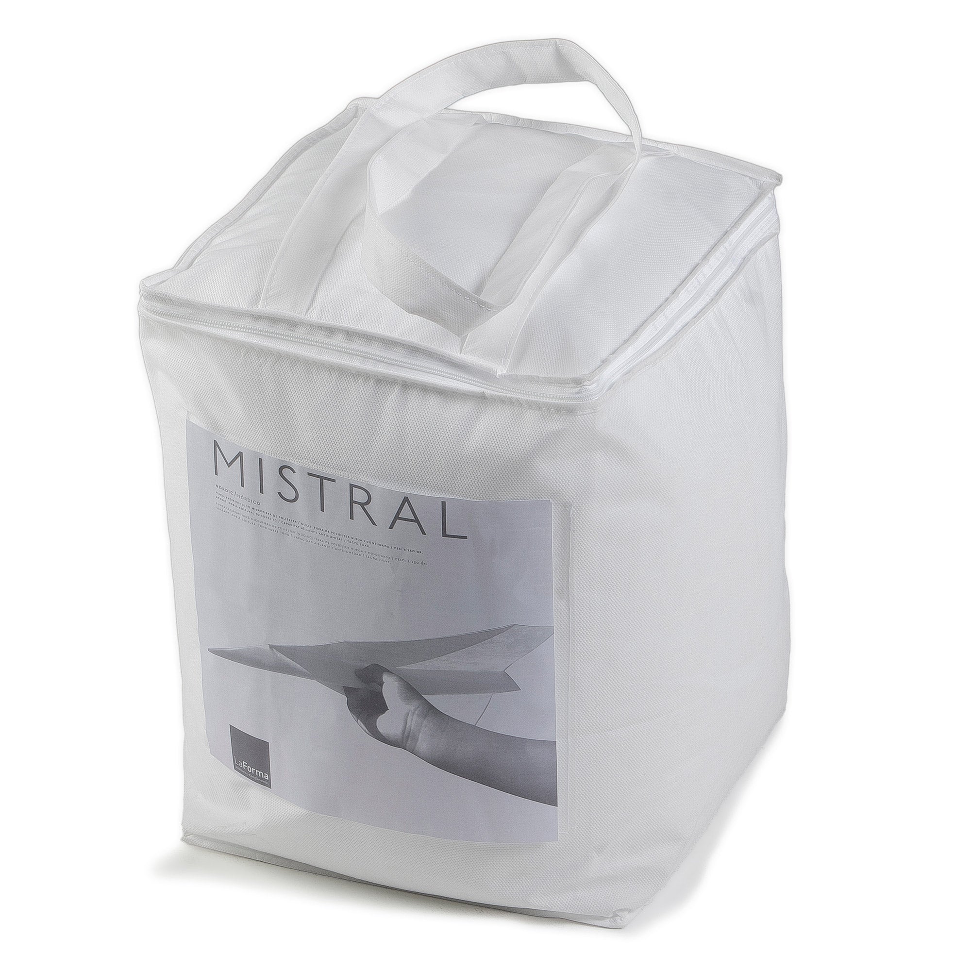 The filling made from hollow Dacron® polyester fiber, which is 100% recycled, ensures volume, uniformity, and long-lasting protection against dust mites, bacteria, and fungi. The duvet Mistral not only maintains an optimal temperature but also helps to keep hygiene for a long time. Locally produced in Spain, it contributes to reducing CO₂ emissions, making it an eco-friendly choice for your bed.