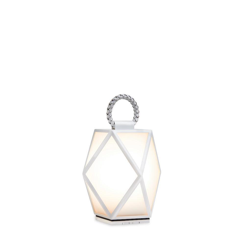 Outdoor lamp Muse is a lantern with an original and valuable design, thanks to its refined details such as a woven leather handle in white, a matte white finish, and a vintage-style structure.