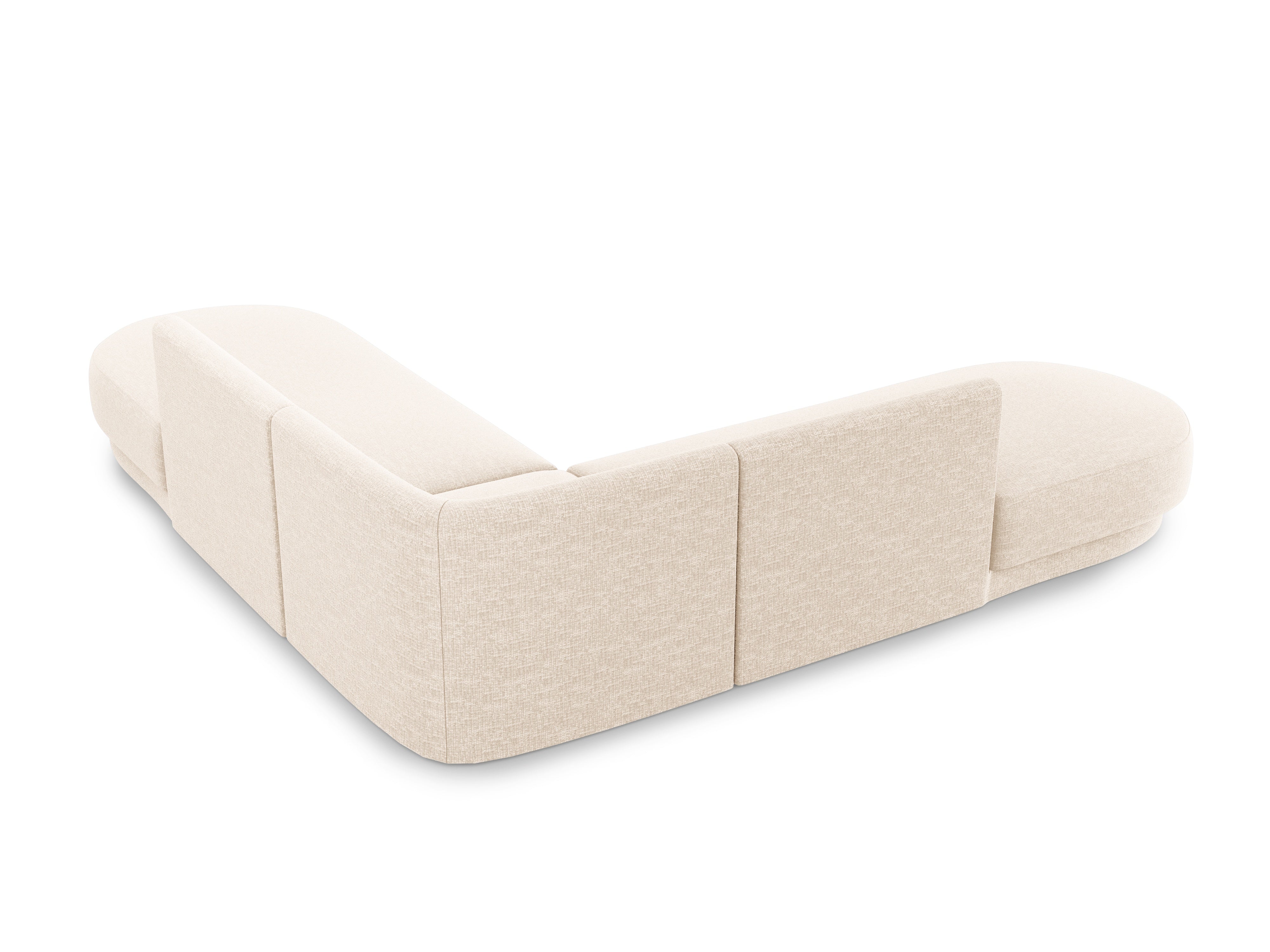 Modern corner sofa Miley captivates with its rounded shapes and subtle lines that perfectly align with the latest interior design trends. Its minimalist form combines elegance with comfort, while the enveloping backrest smoothly transitions into the armrests, giving the whole piece a cohesive, harmonious look. The rounded, resilient seats ensure comfort in every position, and the structure set on a light elevation creates the impression of floating above the ground, adding lightness and a modern character.