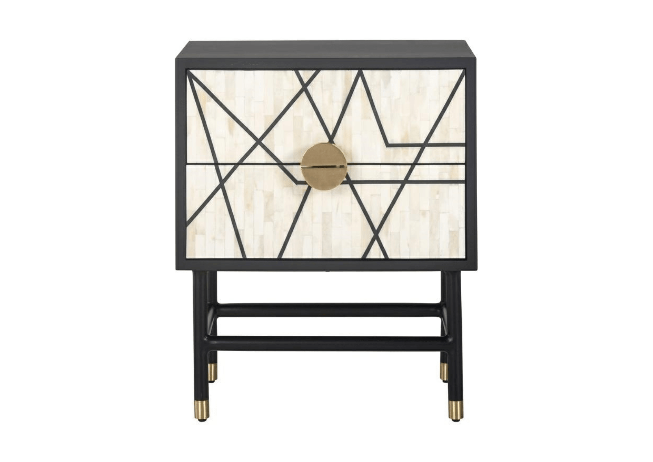 Night stand Novas is a piece of furniture with a unique combination of materials and aesthetic design. This collection uses the highest quality products such as MDF, animal bone and mango wood to create an elegant and durable piece of furniture. In addition, black metal legs with brass accents at the ends emphasize the luxurious nature of the cabinet.