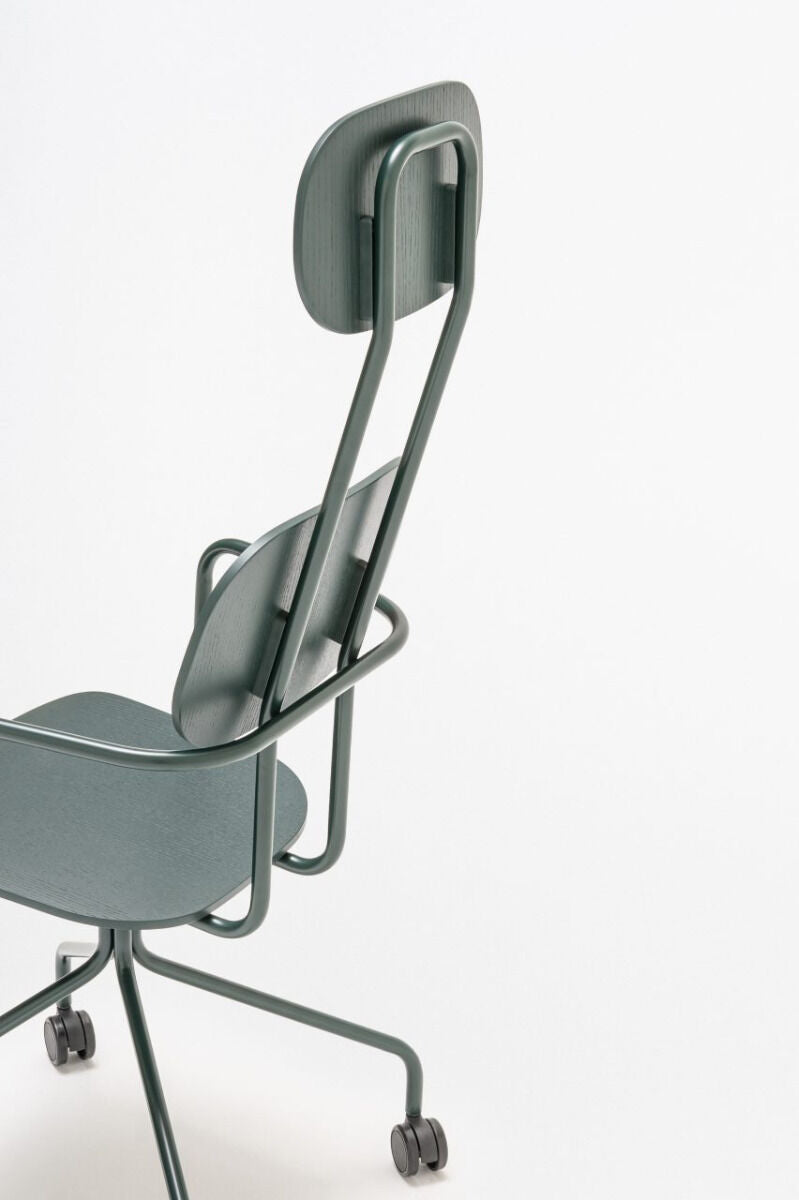 Office chair with headrest New School, designed by Studio Form US with Love, attracts attention with a modern form of double support. This version provides support for the whole back, and the headrest additionally increases the comfort of use. Thanks to the wheels and armrests, the New School chair is not only comfortable, but also functional, allowing for freedom of movement and a comfortable position, even during a longer sitting.