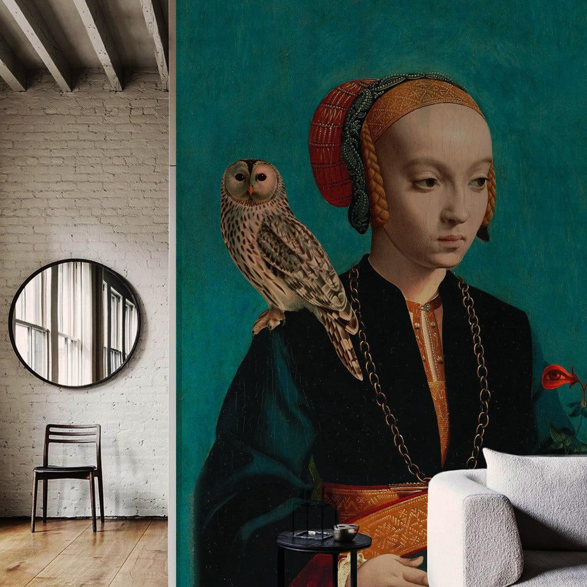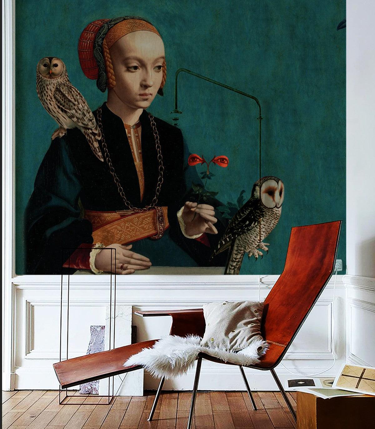 Non-woven wallpaper portrait OWL LADY turquoise
