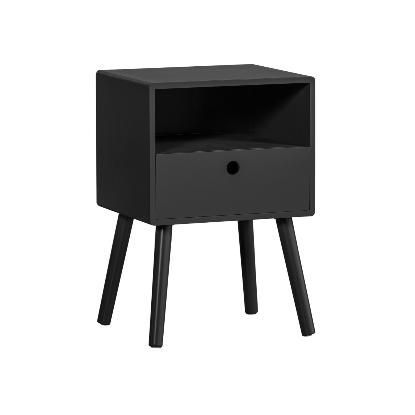 Night stand Ozzy in classic black is a proposal for lovers of minimalist design and functional solutions. Simple form and subtle details make the furniture perfectly fit into both modern and classic bedroom arrangements. Thanks to the open shelf and drawer, Ozzy offers a practical place for the most necessary things right next to the bed.