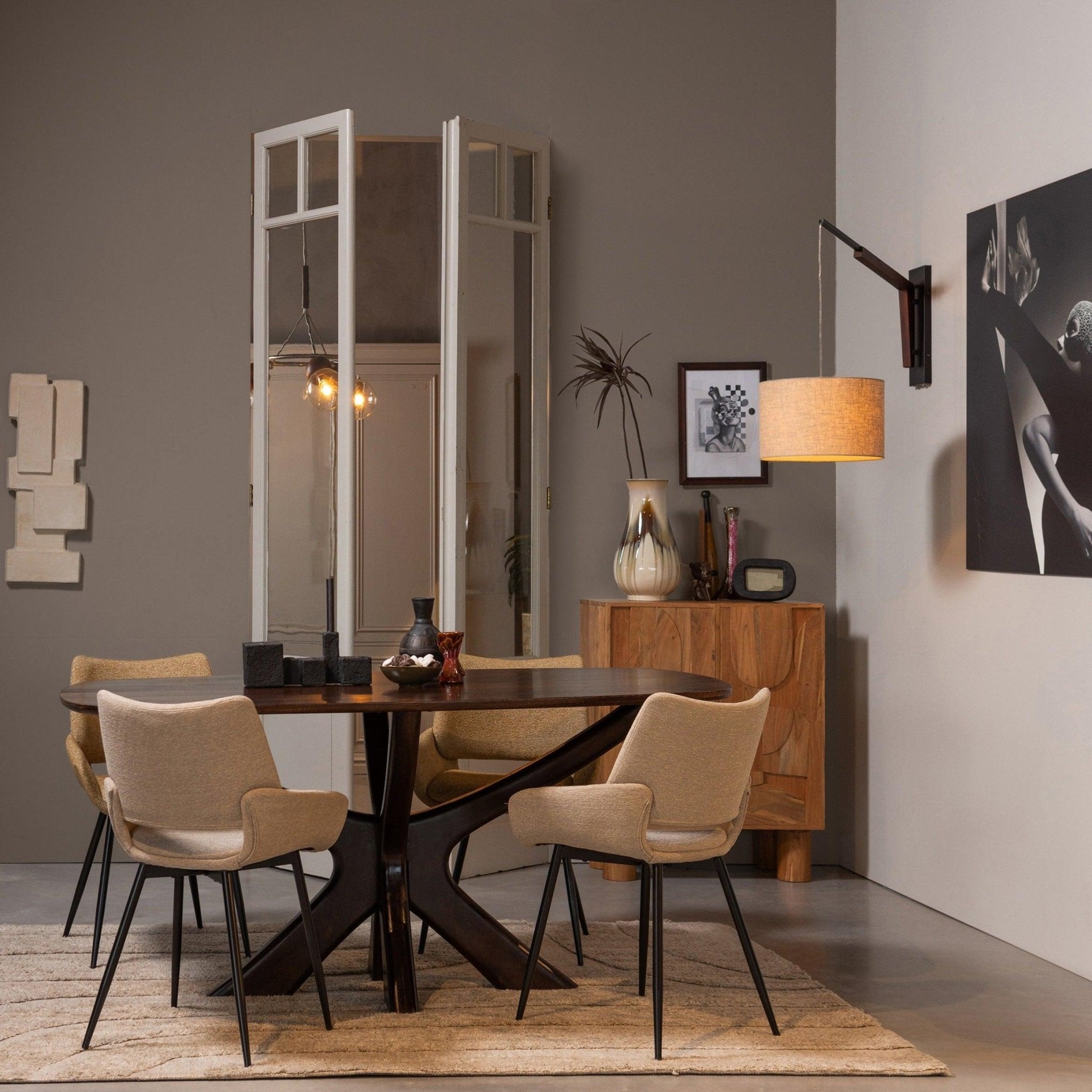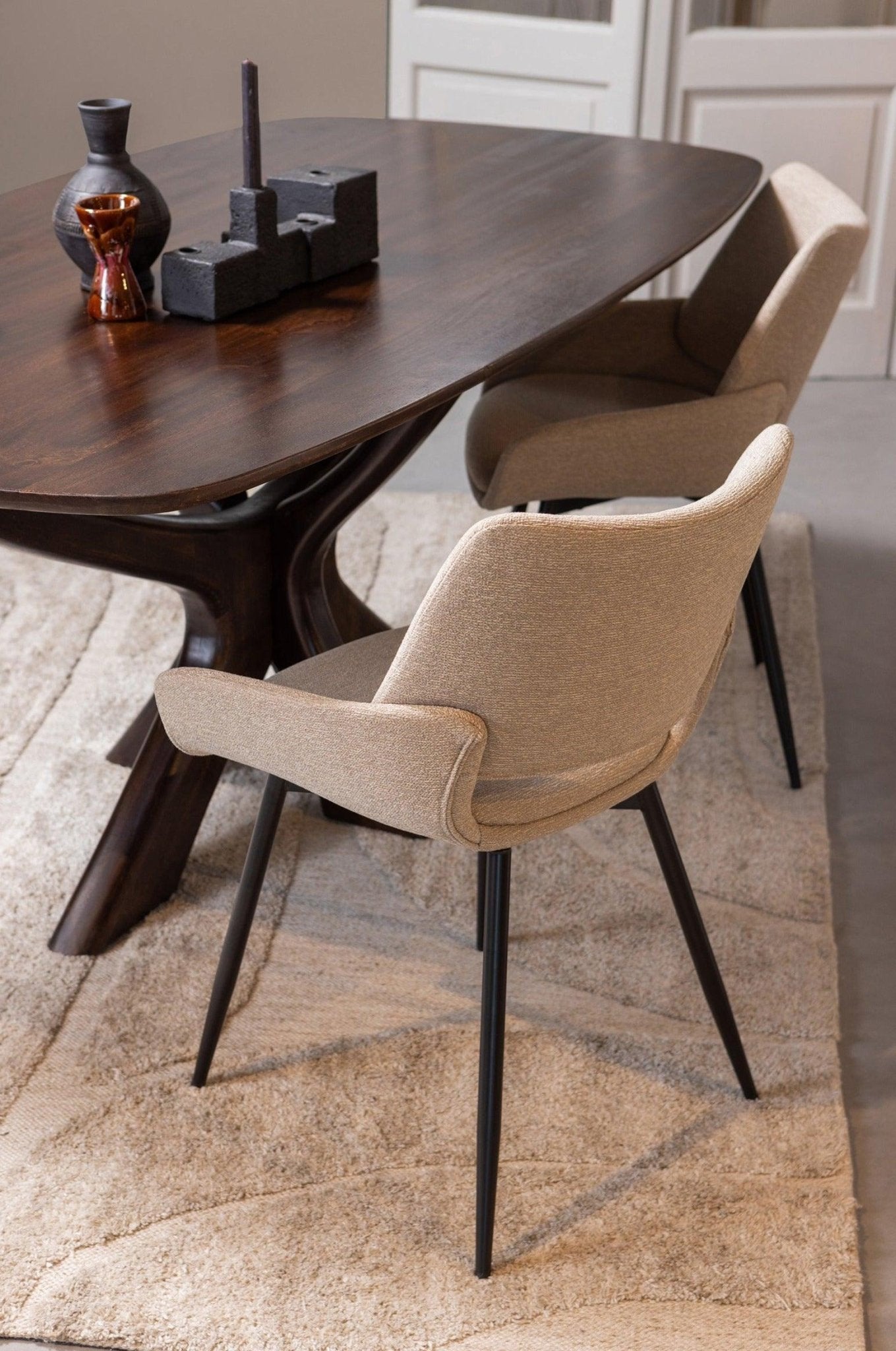 The combination of a dark base and a delicate sand mélange contrasts beautifully, while simultaneously creating a cohesive whole that is hard to forget. The traditional, elegant shape of the chair makes it not only stylish but also comfortable.