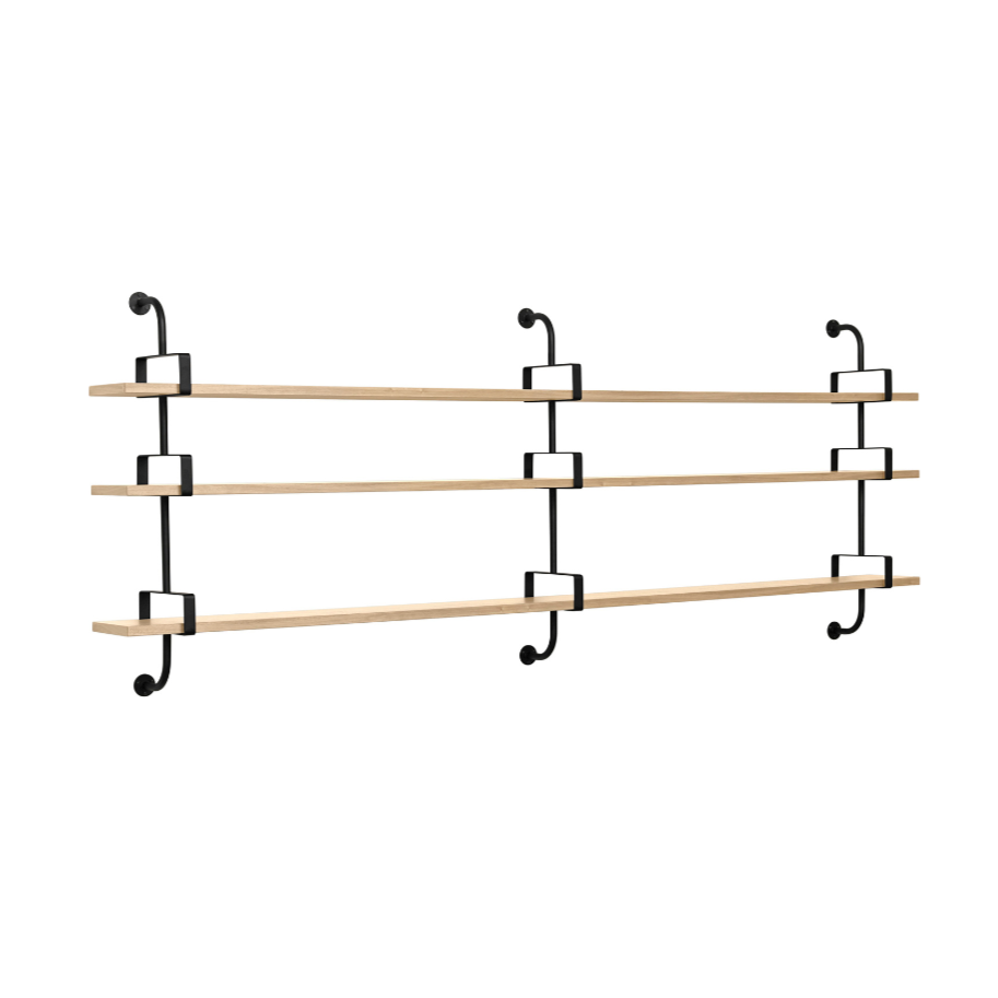 Available in two widths – 95 cm and 155 cm – and in versions with 1, 3, 4, or 5 shelves, the Démon Shelf can be adapted to any interior: from a home office to a living room or dining room. The shelves are made of wood stained in oak, American walnut, or black ash in a matte finish, complemented by minimalist powder-coated brackets.