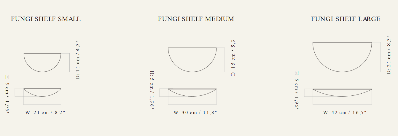 Shelves can be used in many ways – as a nightstand by the bed, a decorative accent in the living room, a spice shelf in the kitchen, or additional space for trinkets in the children's room. Available in three sizes, they can be mounted individually or in sets, creating a cohesive and visually pleasing composition inspired by nature.