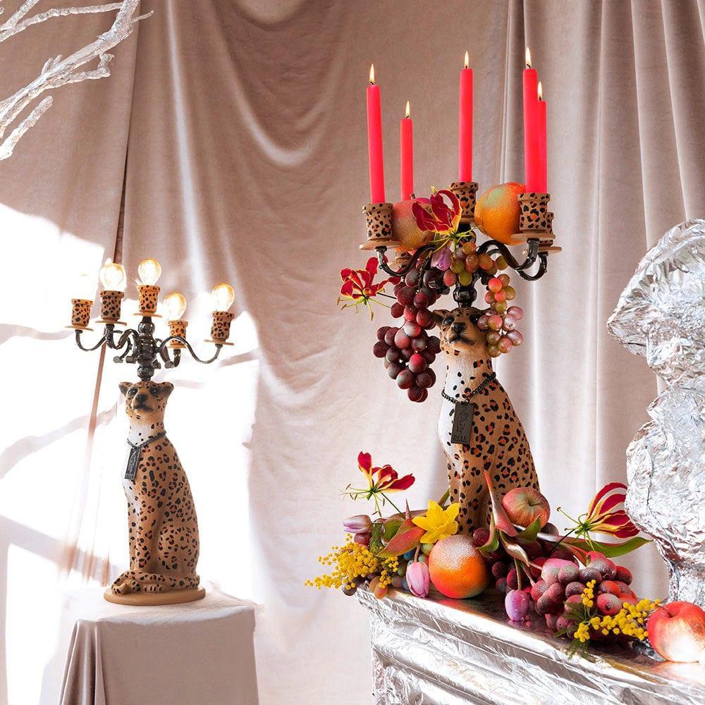 If you love cats as much as we do, this charming panther will steal your heart! Floor lamp The base shaped like a large purring cat is adorned with a golden chain that elegantly stands out against the black body. The proud panther in the crown of a five-armed lamp is the perfect addition for any lover of bold and eclectic interiors.