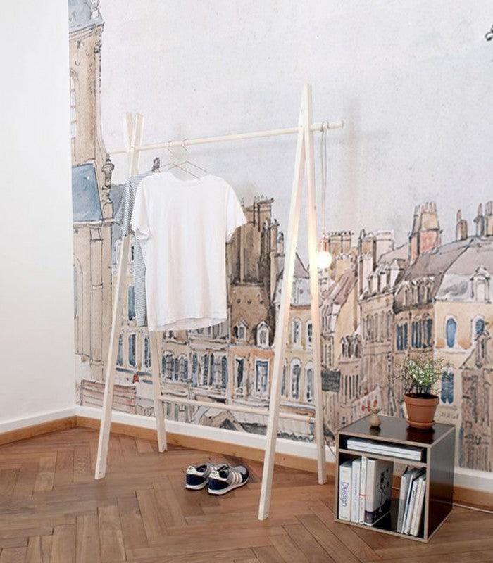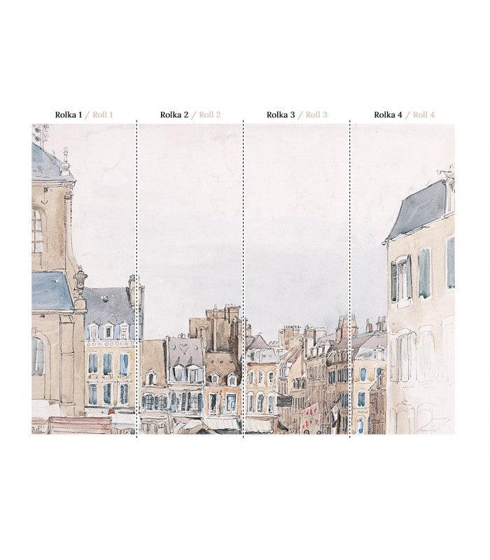 Non-woven wallpaper with urban landscape ROOFS beige with white