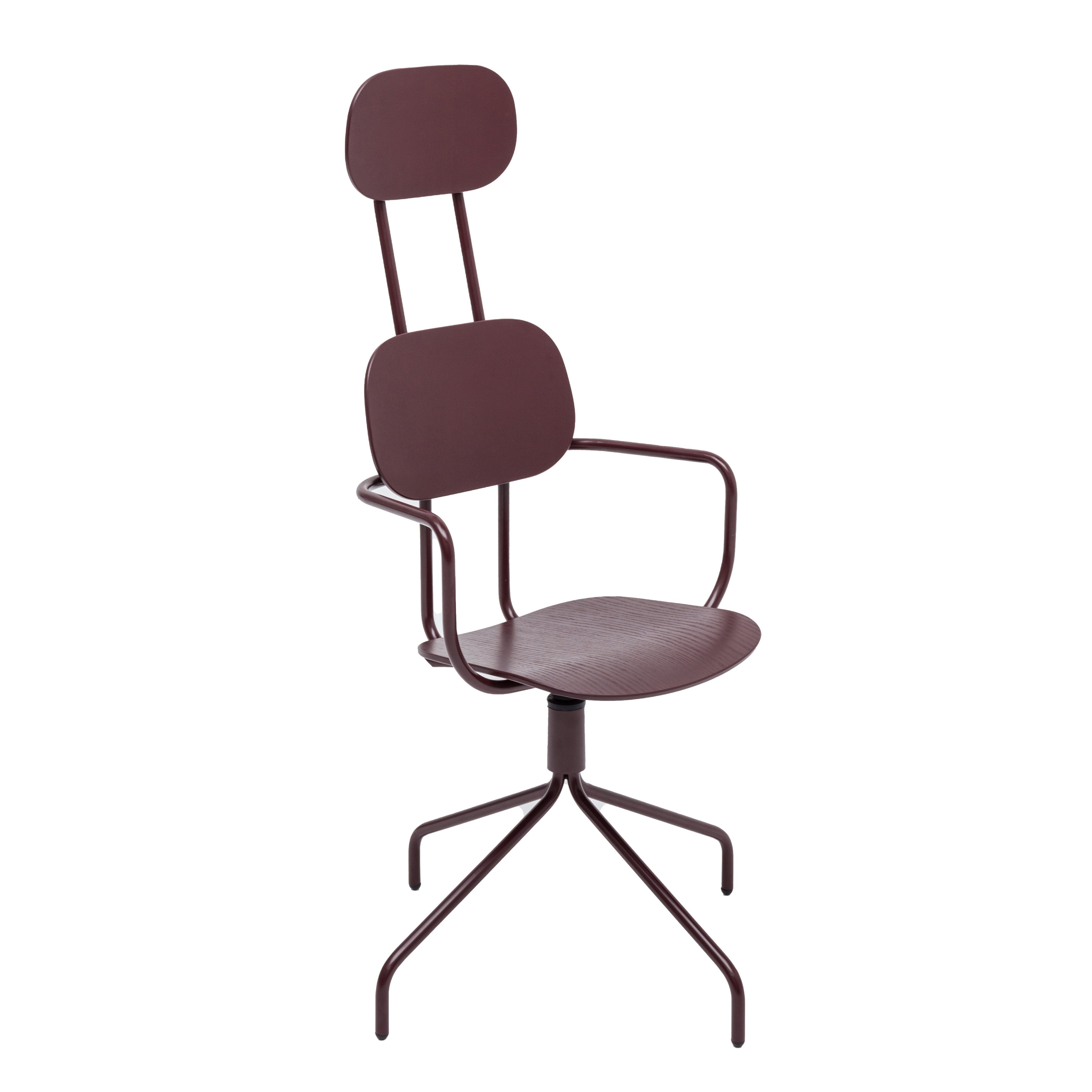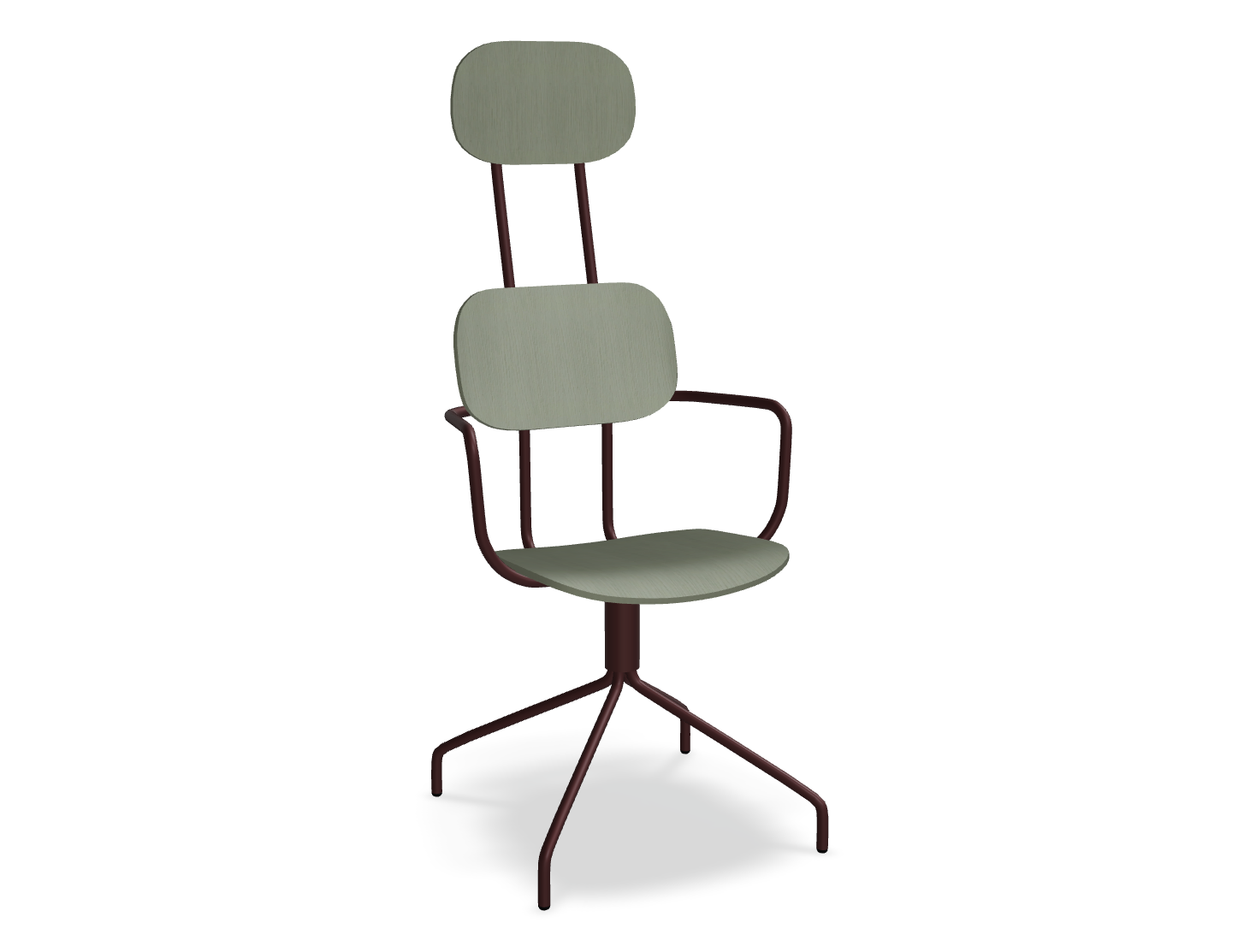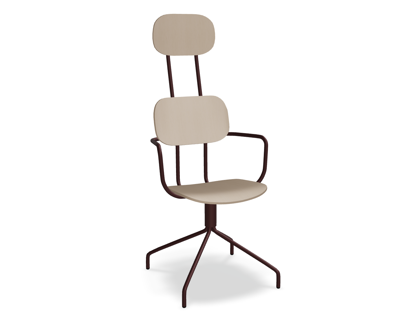 Swivel chair The new school with a headrest, designed by Studio Form US with Love, attracts attention with a modern form with double support. This backrest not only emphasizes modern design, but also provides excellent support for the whole back. The rotating base guarantees freedom of movement, and optional armrests further increase the comfort of use. The plywood version is distinguished by durability and ease of care, which makes it an ideal choice to the space used by many people.