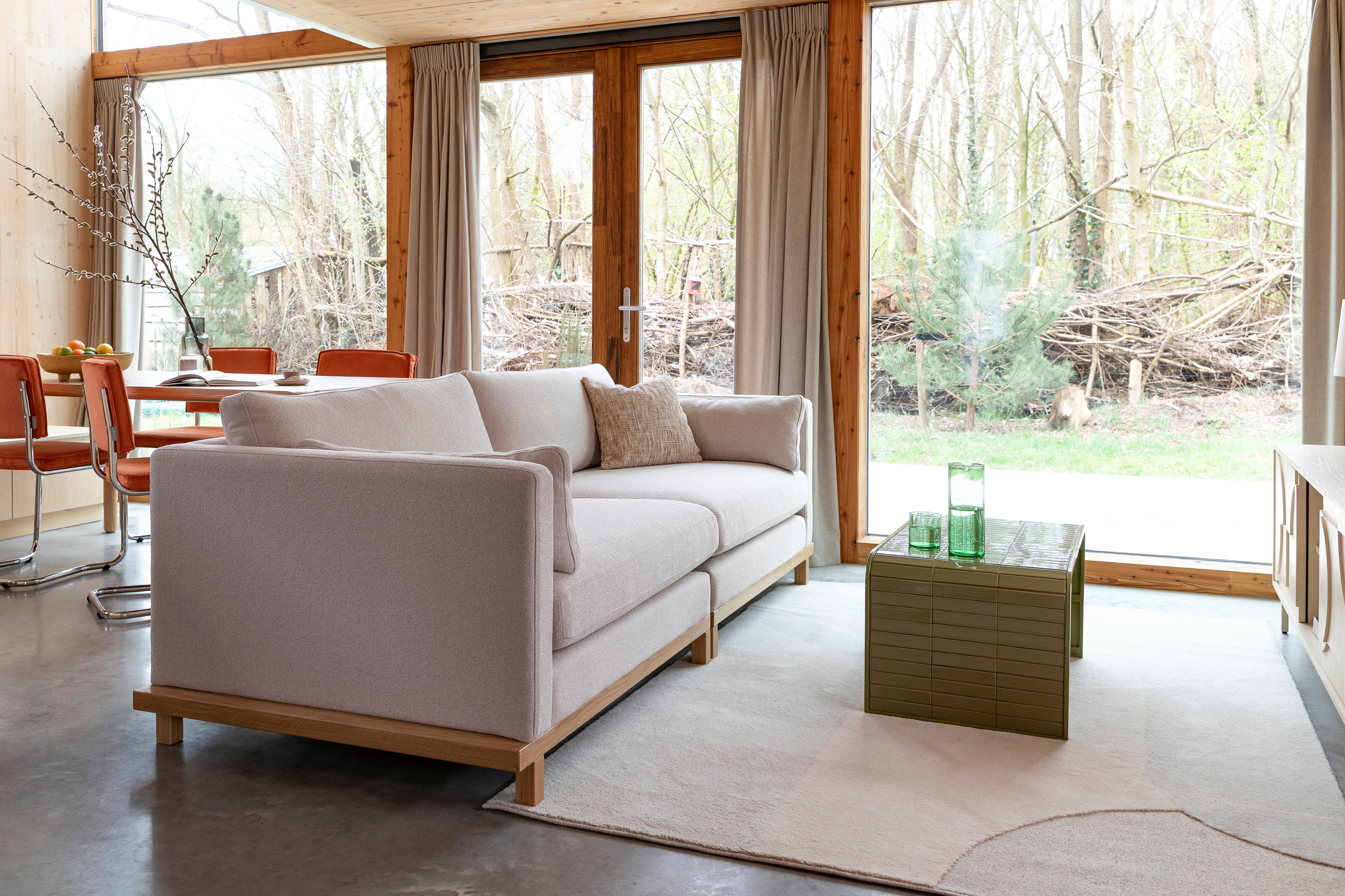 Sofa Blossom is a combination of elegance and subtle originality. Its lower profile brings lightness to the interior, while the massive, slightly wider base than the seat gives it a unique character. Made of solid oak wood, it provides a sturdy construction that delights with its natural appearance and durability. The whole is complemented by upholstery made of thickly woven fabric, which not only visually warms the space but also adds texture and depth.