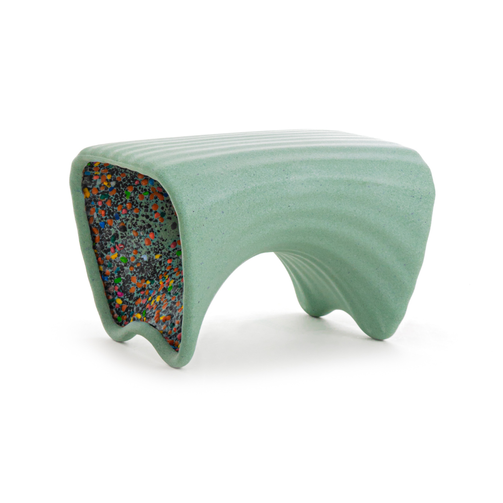 In-Side Stool is a compact piece of furniture with a dual function, designed by Thomas Heatherwick in 2024. It can serve as a low table or a seat. Made from polyethylene containing 30% post-consumer recycled material. Unique, colorful accents made from processed industrial waste are found on the sides, making each piece one of a kind.
