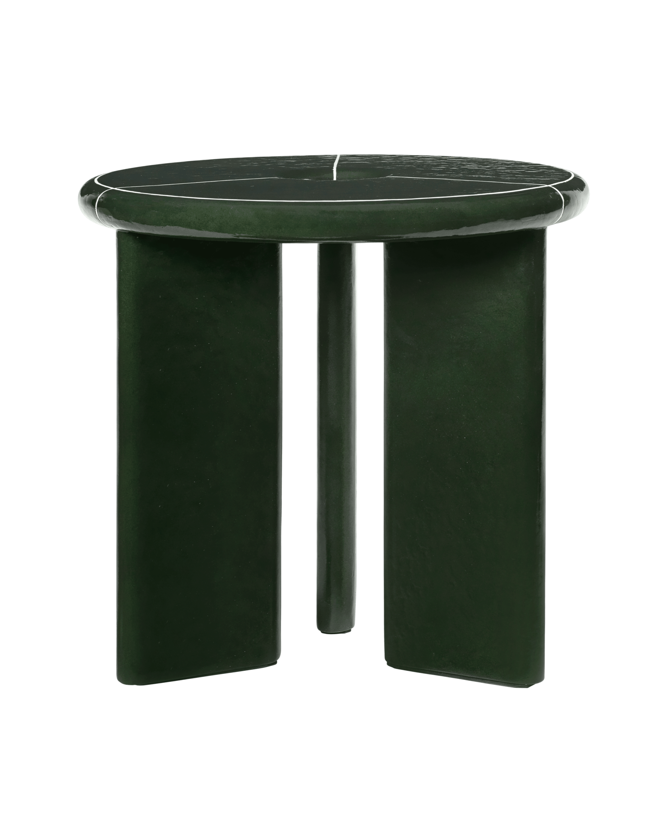 Side table Deya captivates with its bold aesthetics and refined craftsmanship. Made from fiberglass-reinforced concrete, it is coated with a dark green glaze featuring an irregular texture, with distinct, light-colored joints. The segmented top gives it a modern, graphic character, while the rounded edges introduce a subtle lightness.